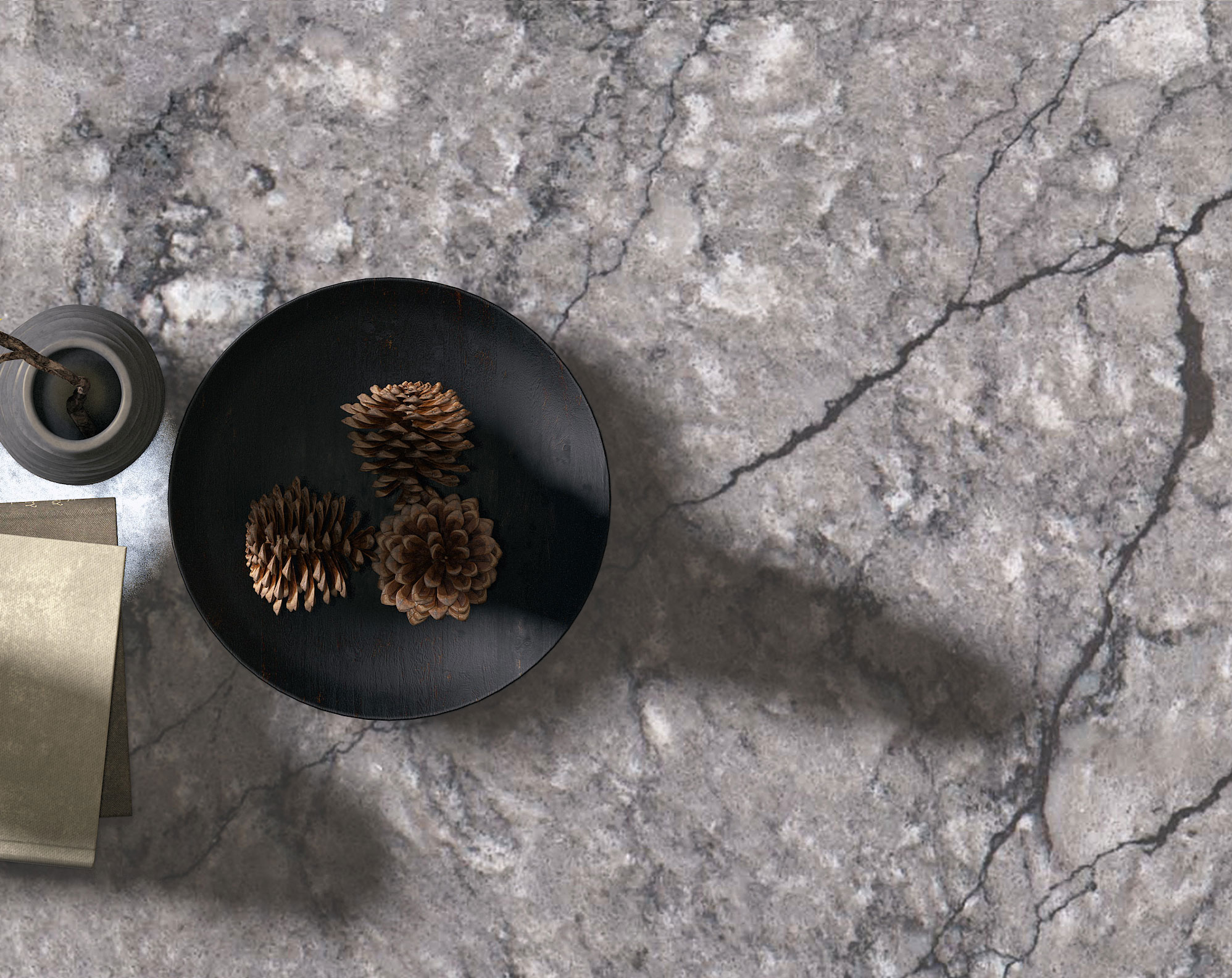 Vicostone Thunder Grey-Steinprodukte zeichnen sich durch rissige Strukturen aus, die sich wie Blitzeschläge auf der gesamten Platte ausbreiten. Diese Strukturen wirken besonders eindrucksvoll auf einer Oberfläche in hellgrauer Granit-Optik.