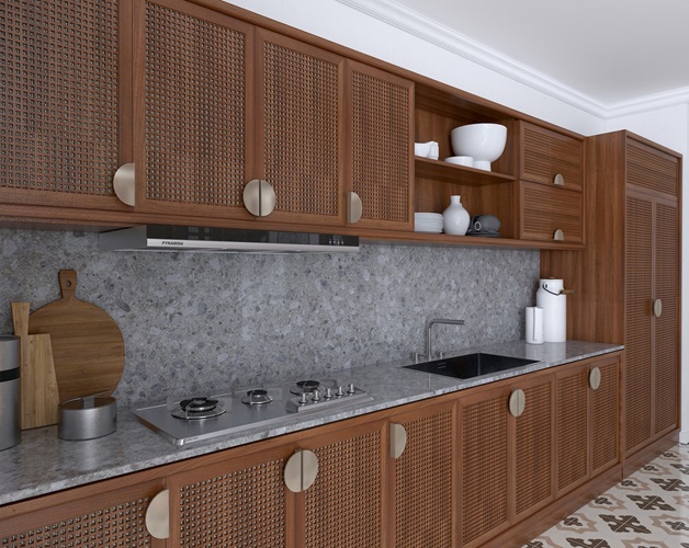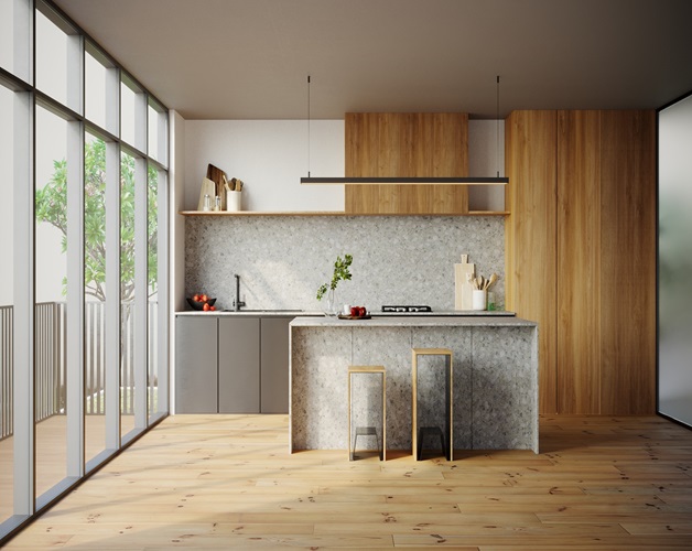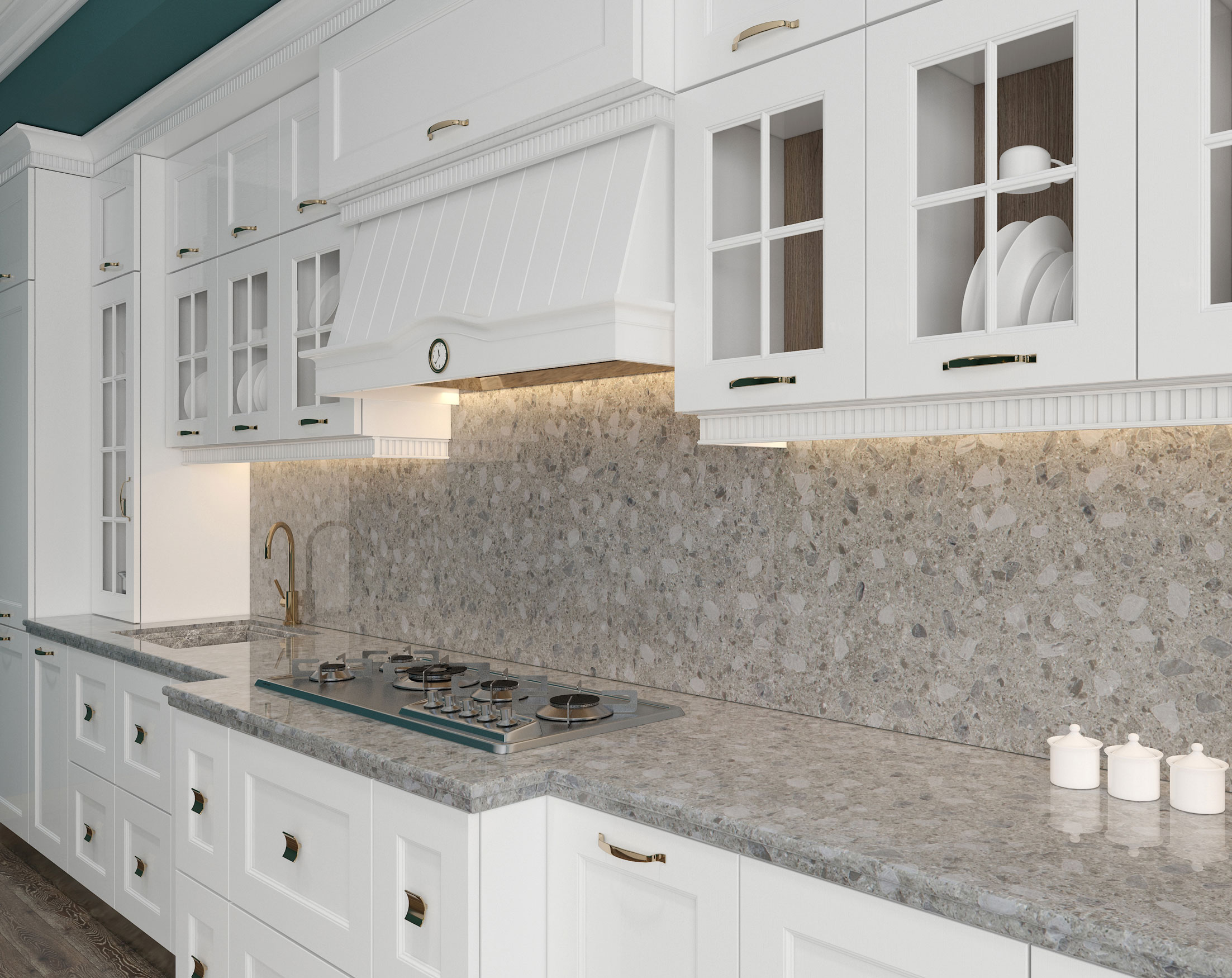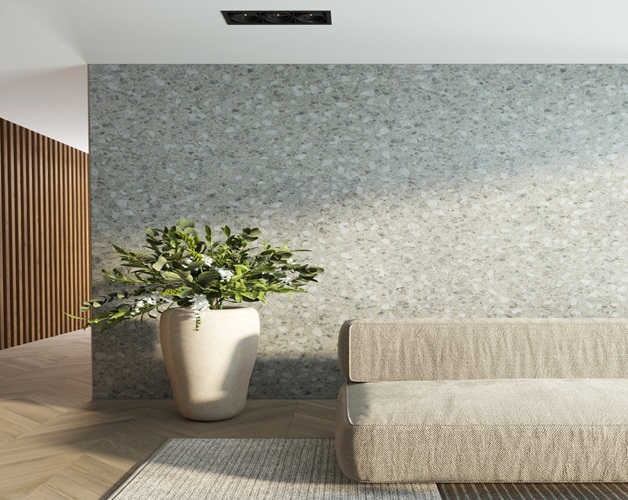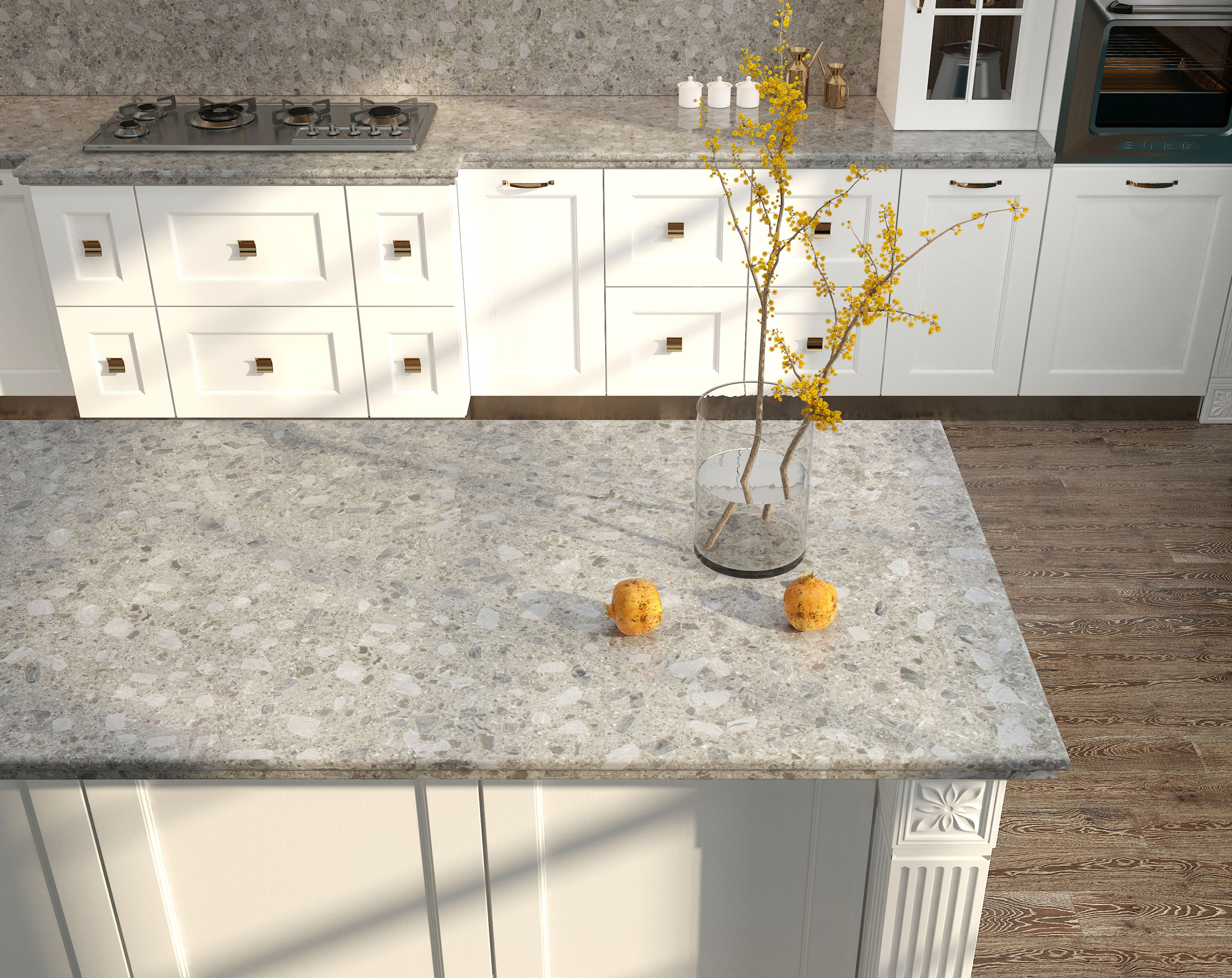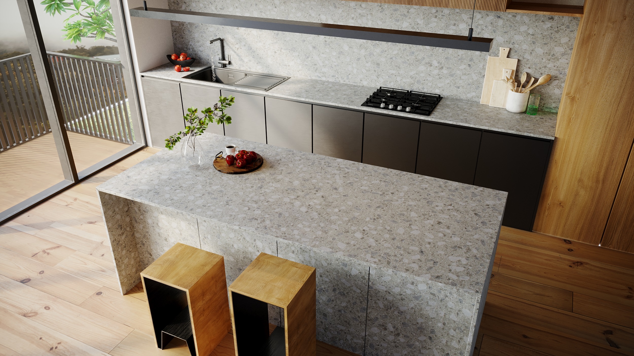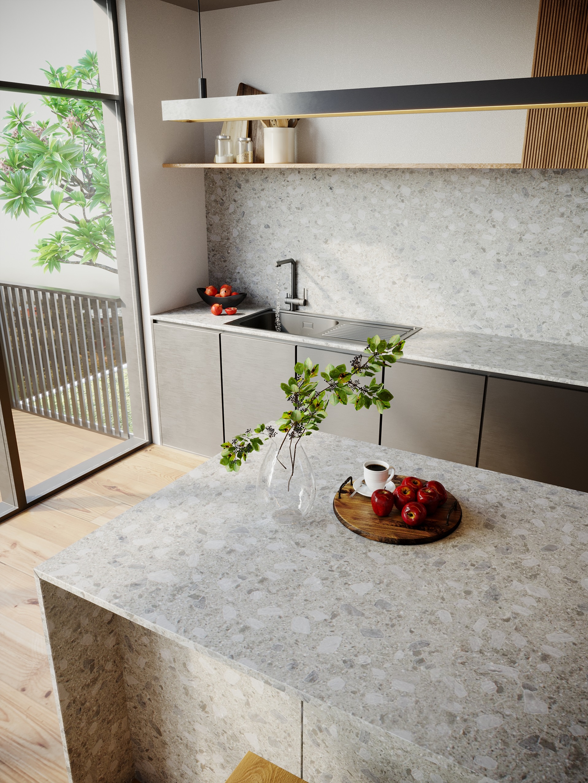 Constituée d'une harmonie de fragments de taille moyenne et d'une tonalité sombre et neutre sur un fond gris clair, la Cepodio® Vicostone rappelle la beauté d'antan reflétée dans le marbre Terrazzo couplée à la beauté naturelle de Cepodio®.