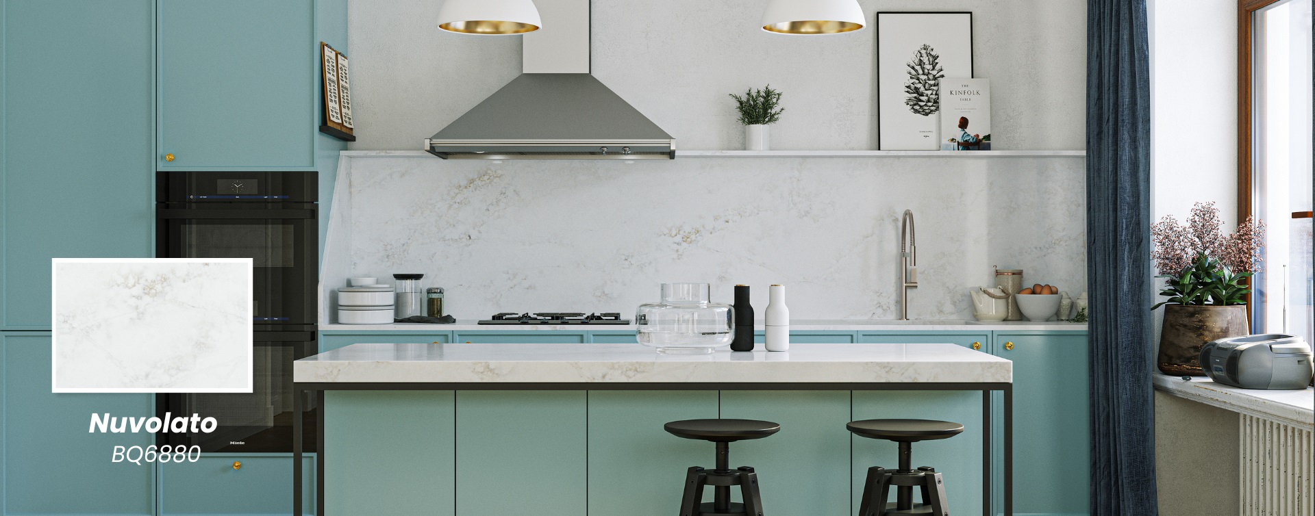 Nuvolato BQ6880 captures the ethereal beauty of soaring through a cloud-strewn sky. Inspired by a soft white-gray background with a flowing texture of clouds featuring elegant beige and gray veins, this surface evokes a sense of serene elegance and weightless freedom.