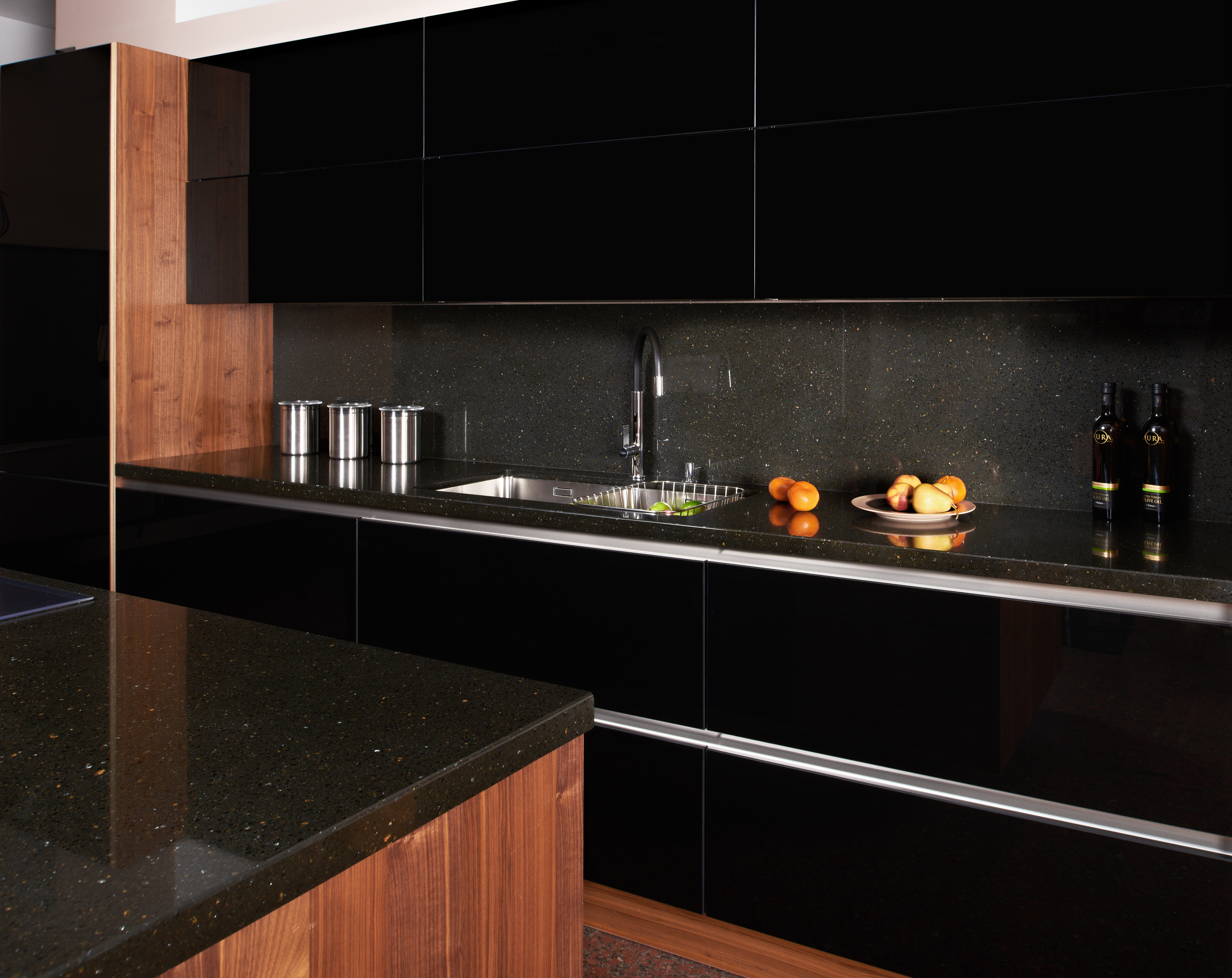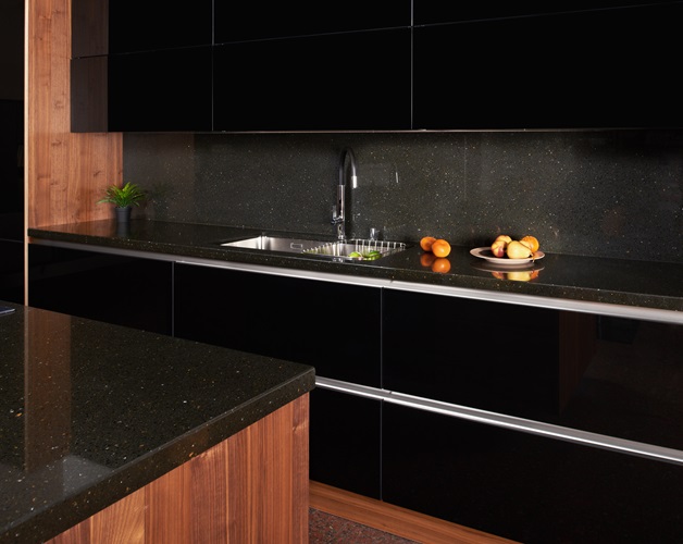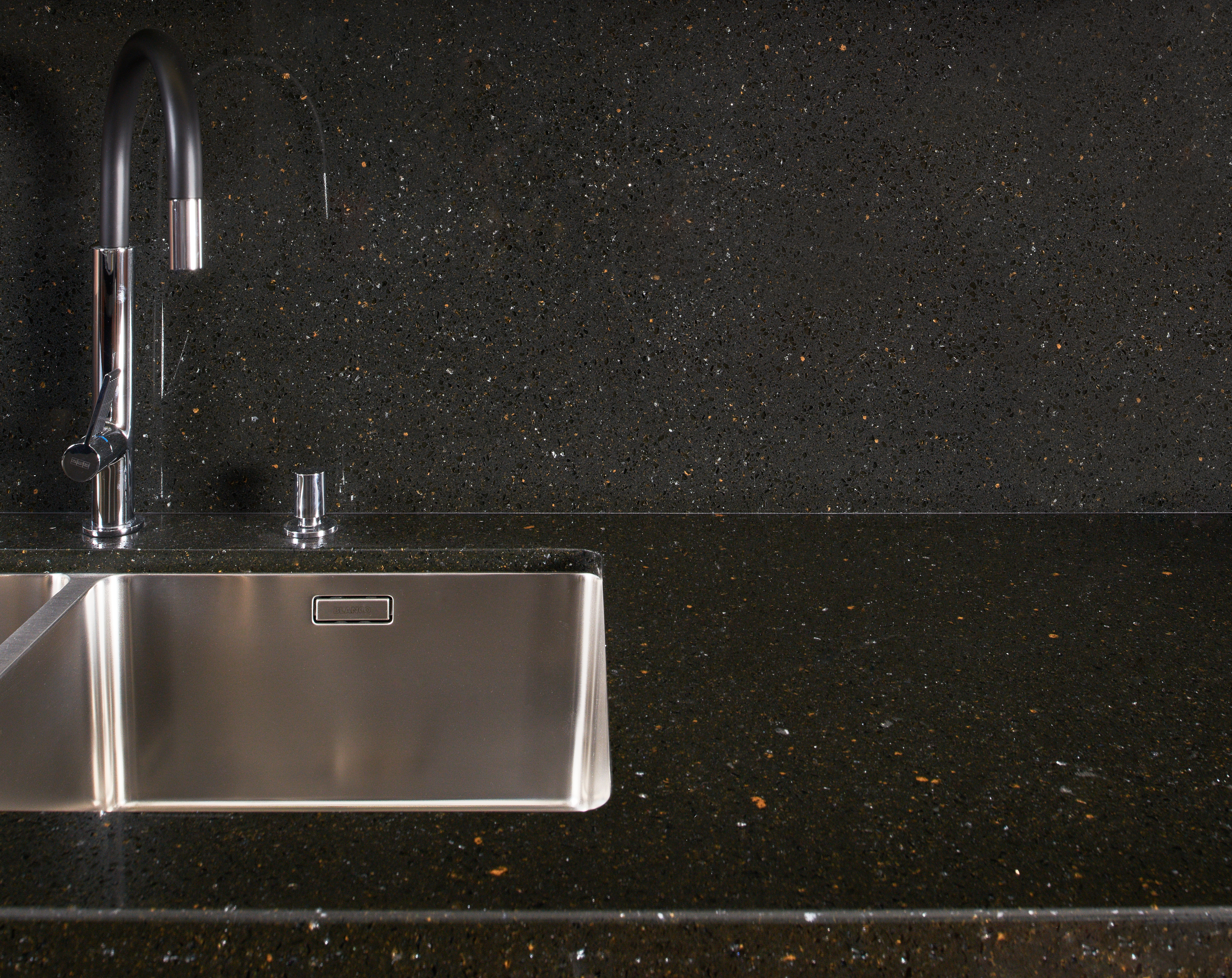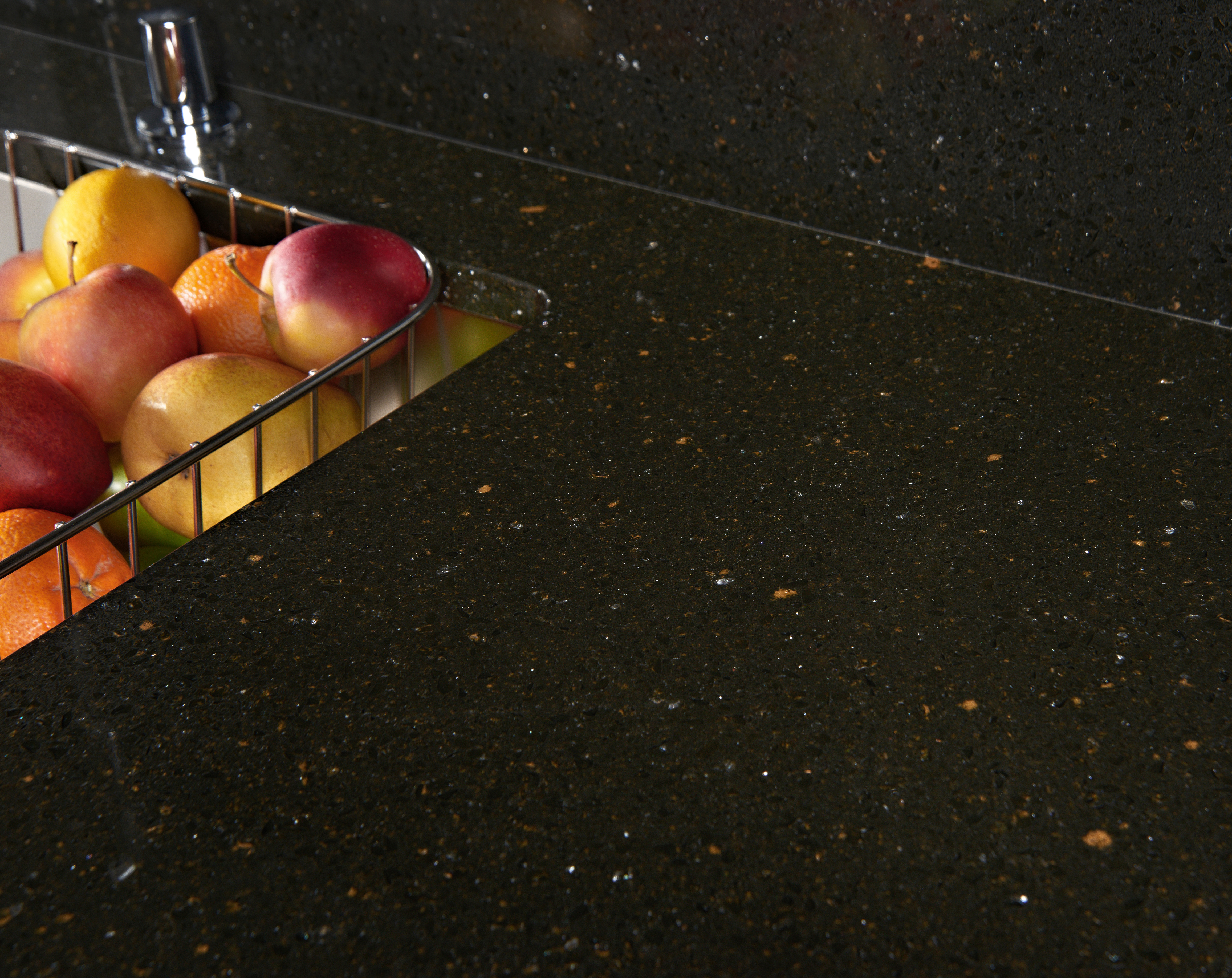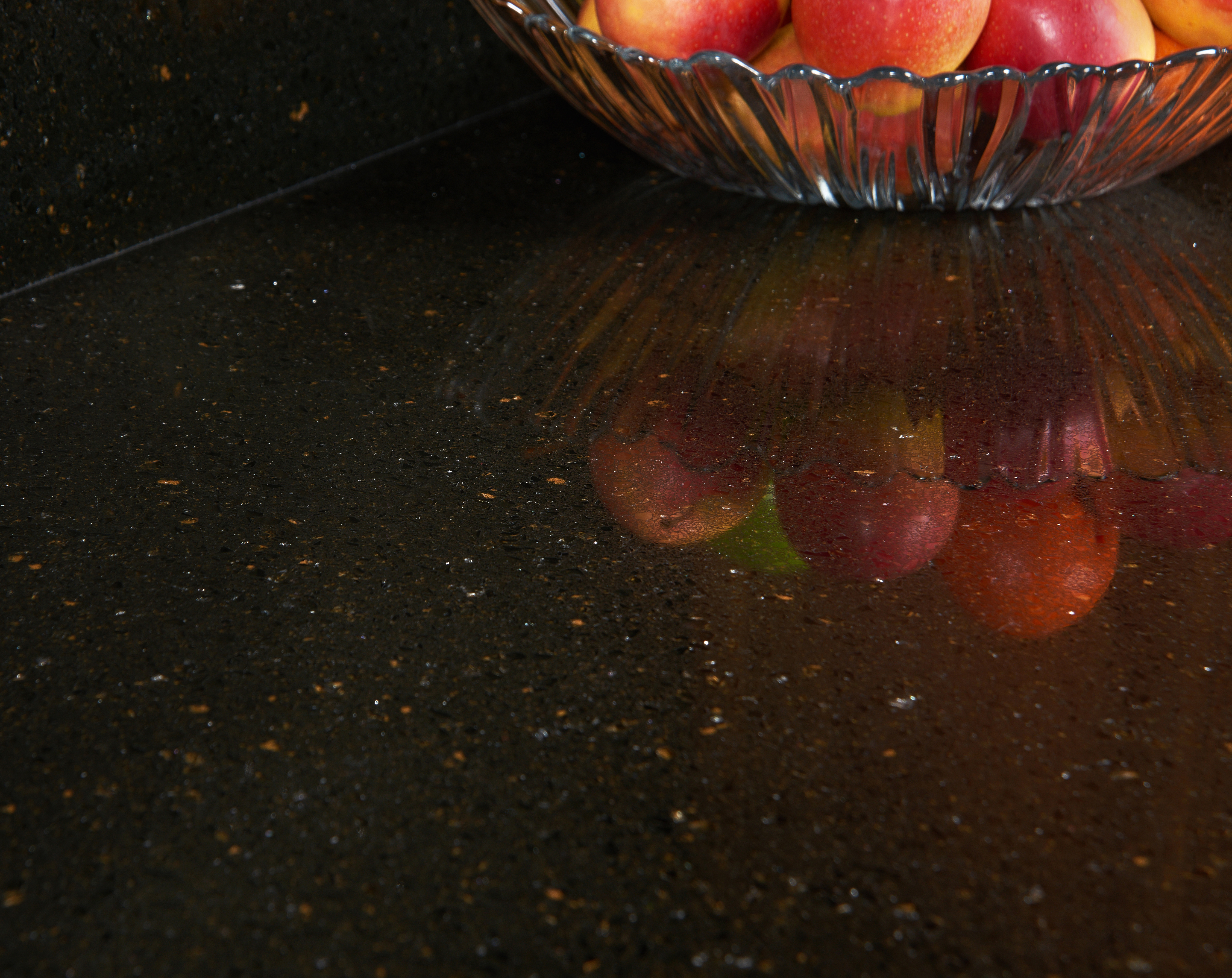 Vicostone Royal Gold simulates the traditional beauty of granite with varying-sized quartz aggregates and spots of warm earth tones on a black background.