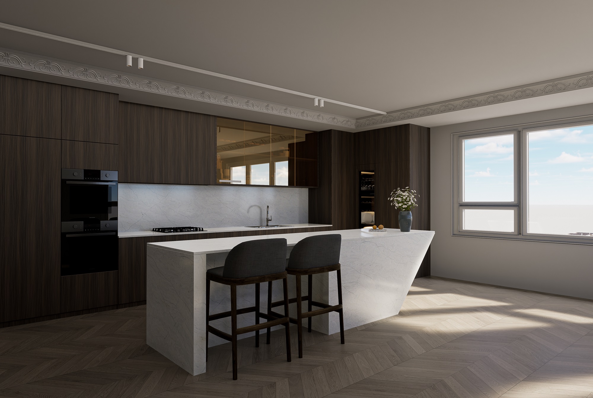 Inspired by natural quartzite and cliff by the sea, Cipollino combines an array of shades of warm grey in the background with strong dark gray veins sprinkled with across the surface. Its multitude of color create contrast while still maintaining the beautiful depth of quartzite with smooth layers.