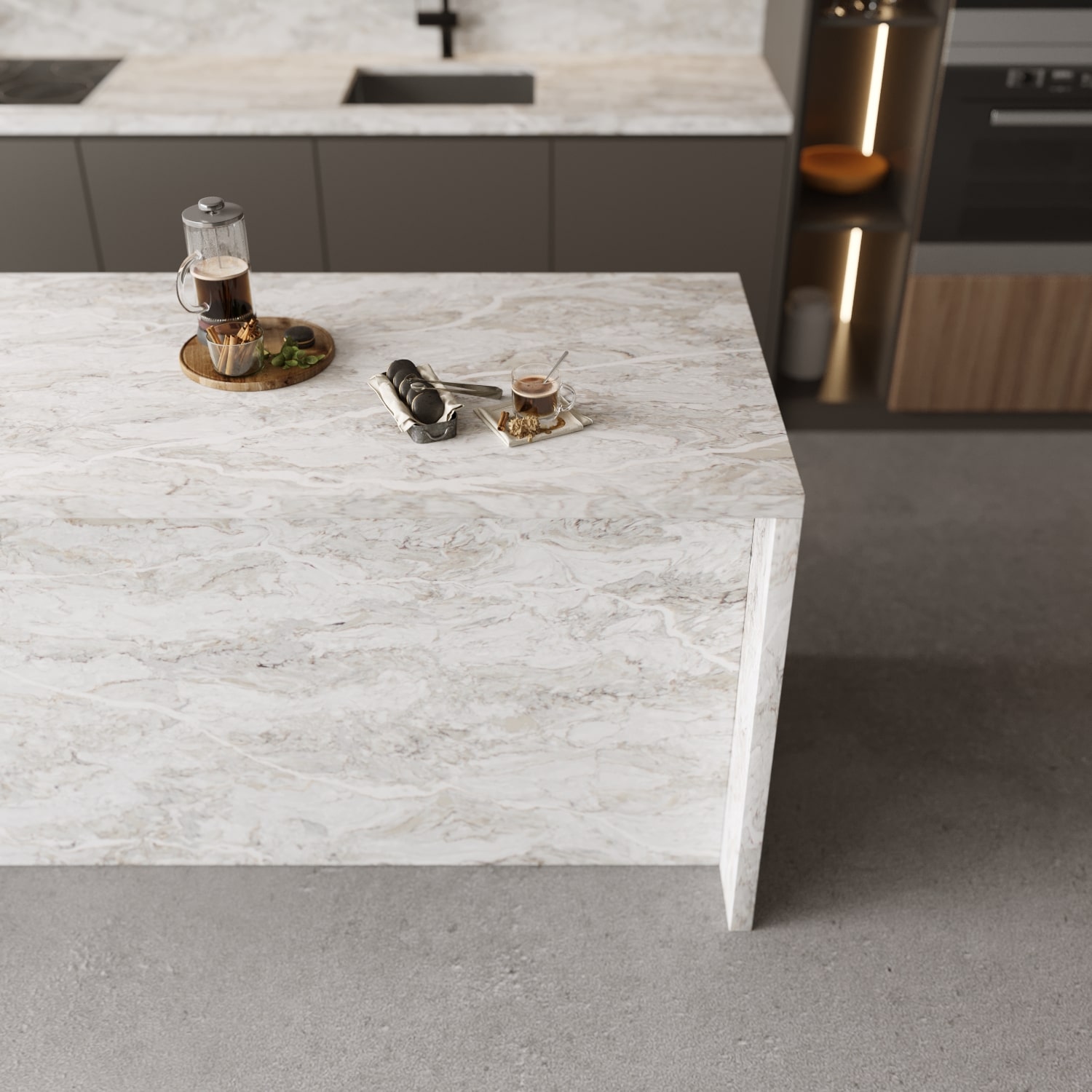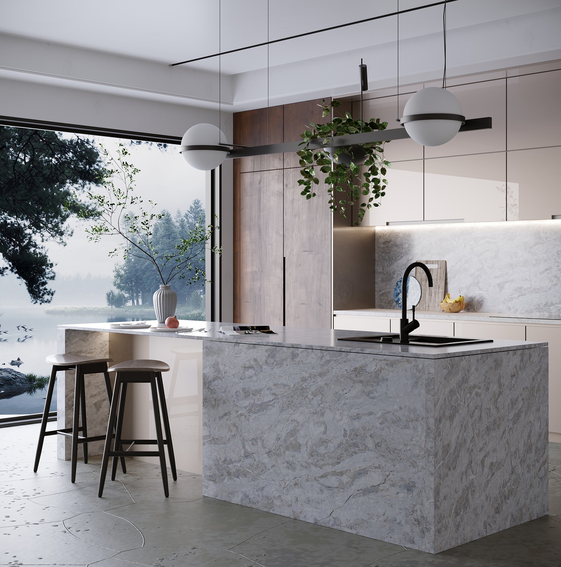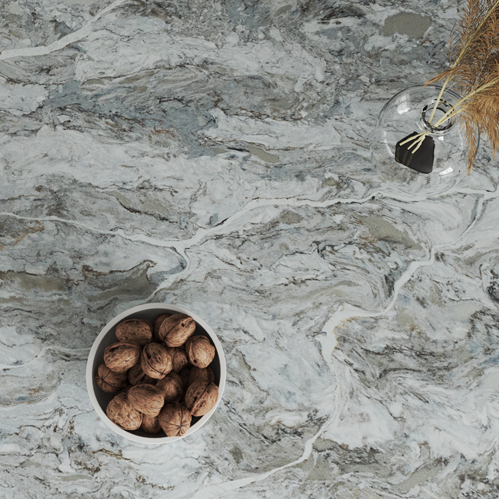 Inspired by natural quartzite and cliff by the sea, Cipollino combines an array of shades of warm grey in the background with strong dark gray veins sprinkled with across the surface. Its multitude of color create contrast while still maintaining the beautiful depth of quartzite with smooth layers.