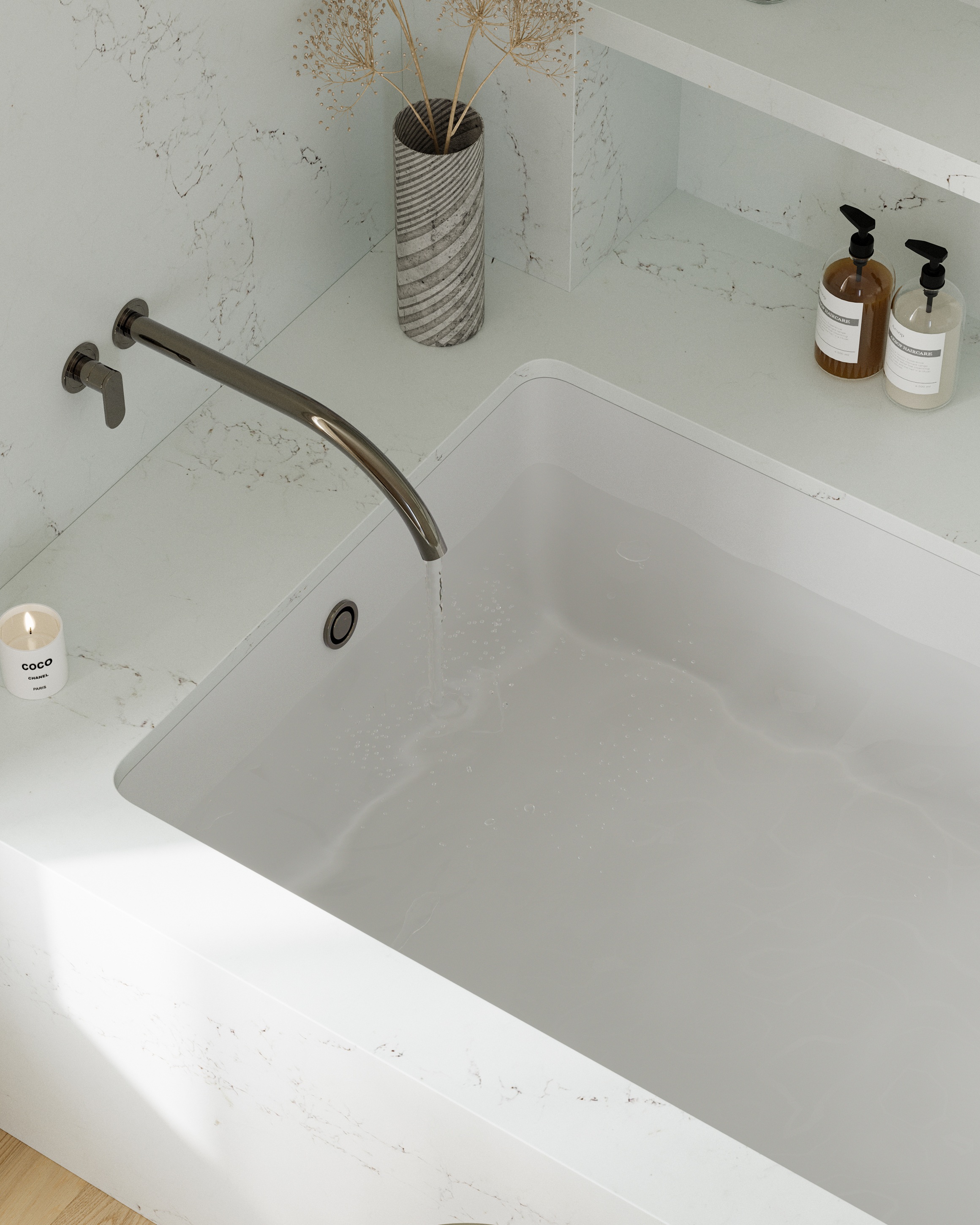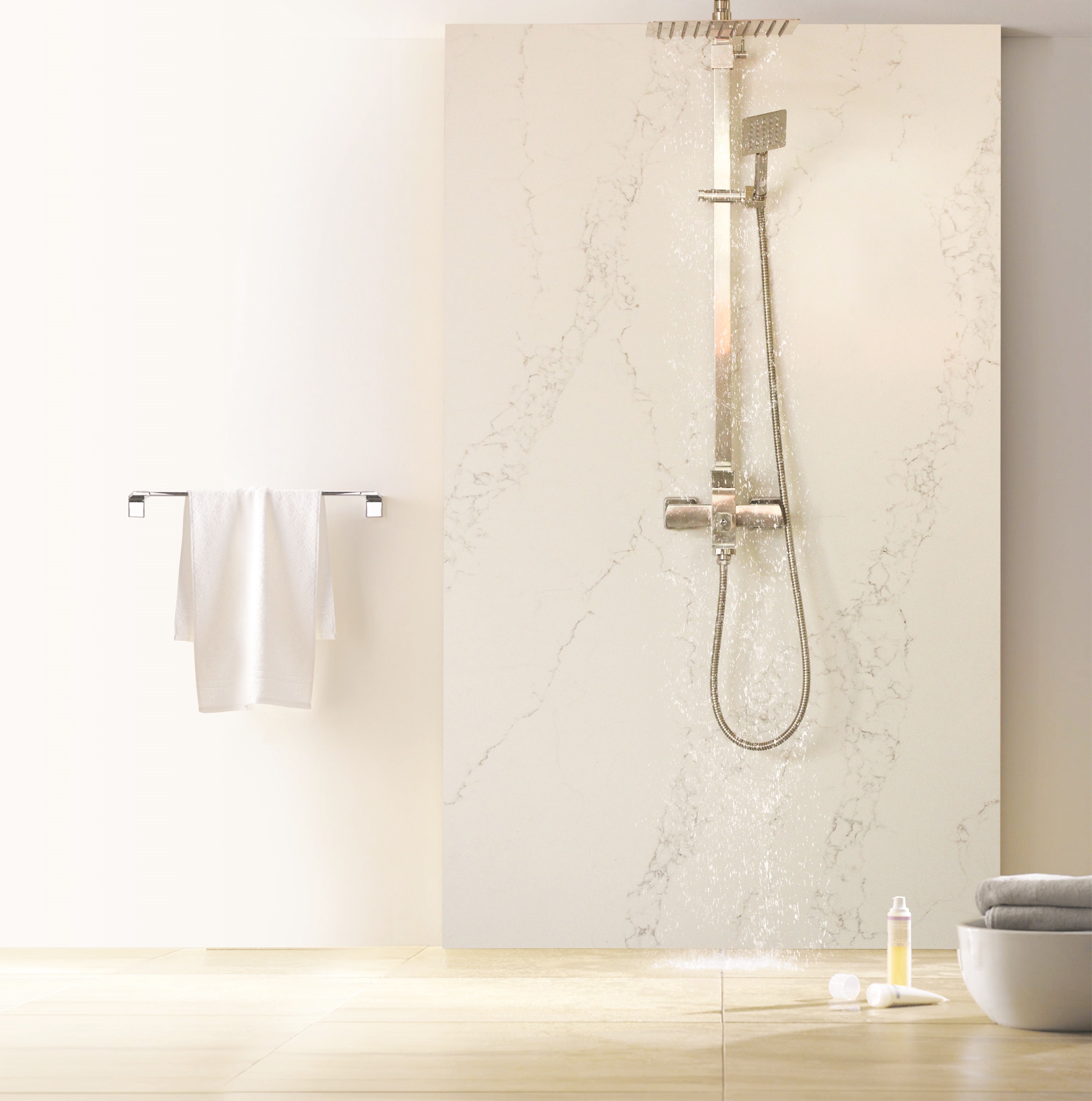 Vicostone Statuario depicts flowing rivers on a sheer white snow background. Lively streams cross in a grid pattern reminiscent of snow-covered rocks peaking above the flowing current. A luxuriously subtle design.