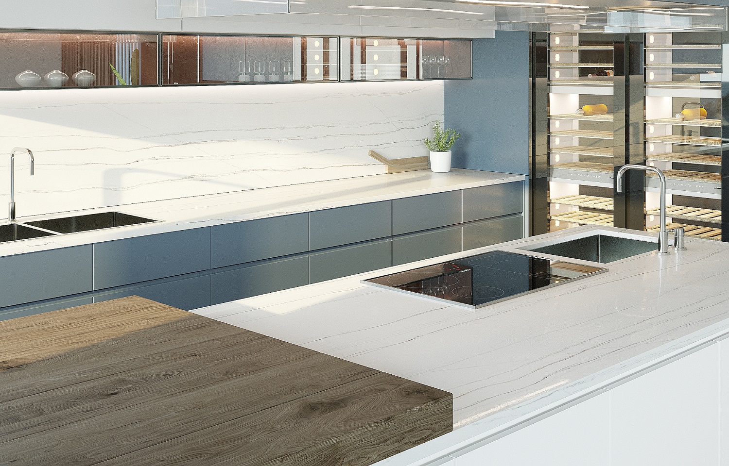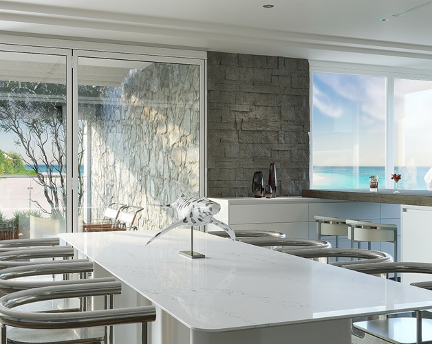 Inspired by the Brazilian White Macaubas quartzite famous for its stunning linear veins, Vicostone‘s New Macaubas is created with a combination of blended dark brown, blue and gray veins the length of the slab.