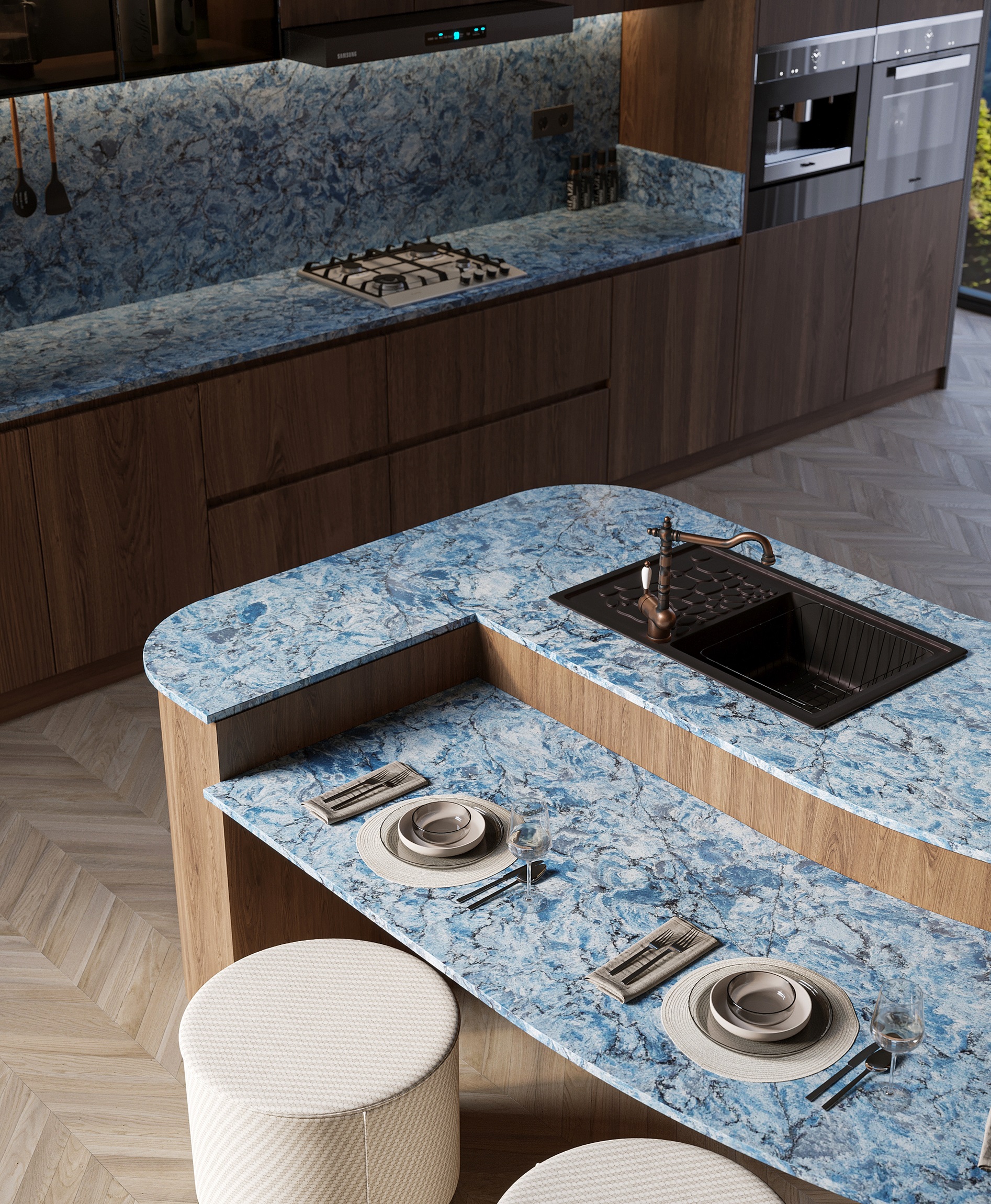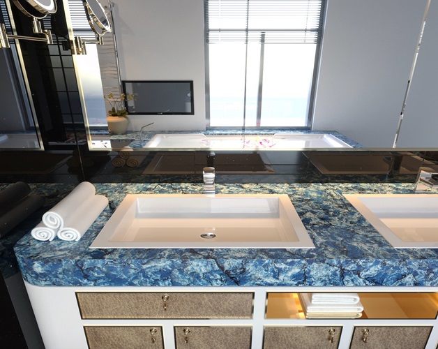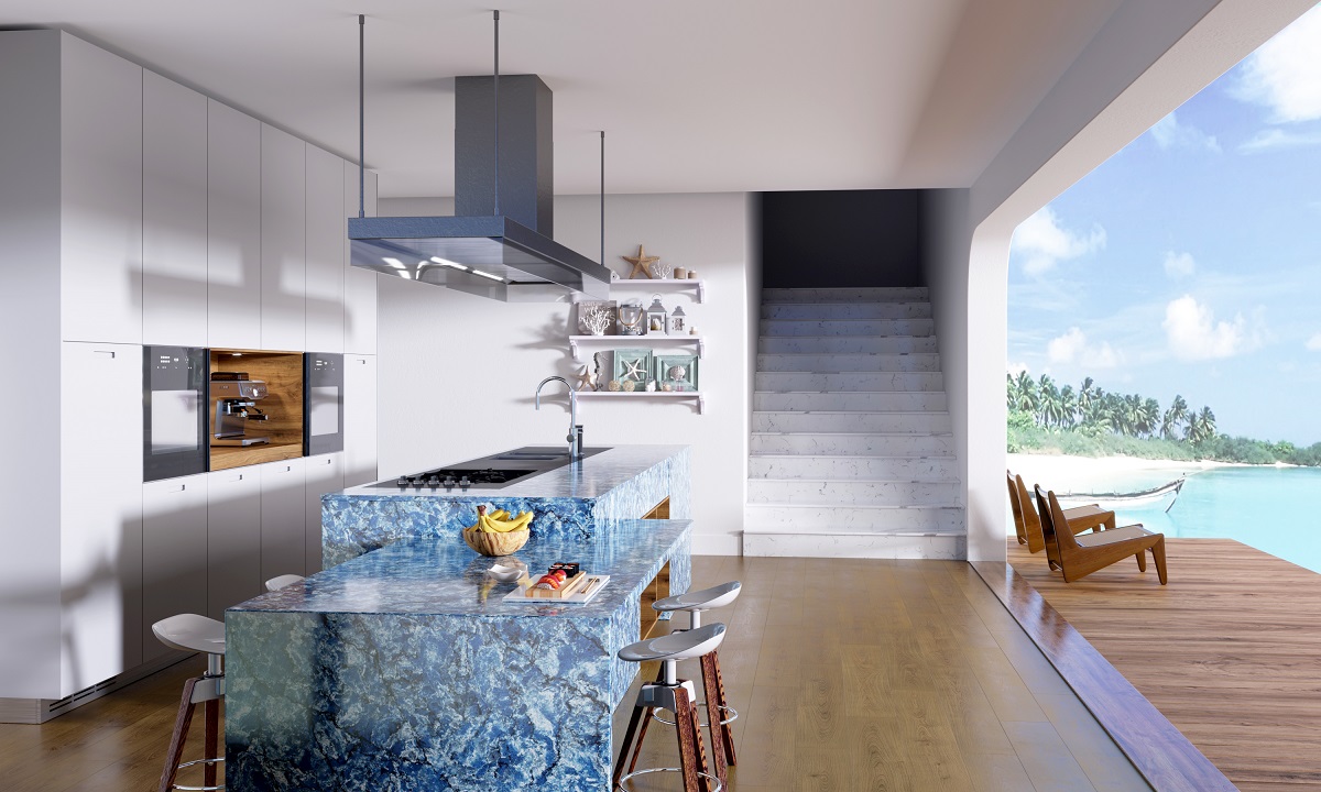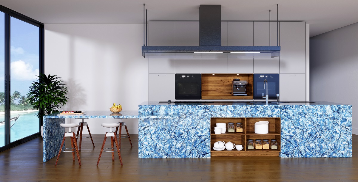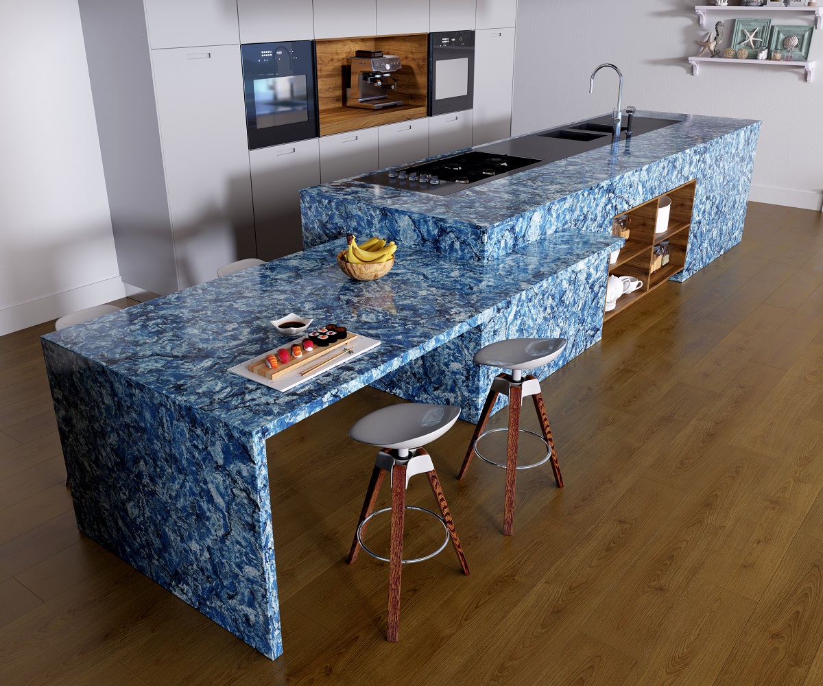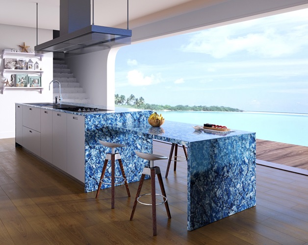 From Vicostone’s Thunder Series, Thunder Blue dark veins pop on an ocean-blue granite-look background.
