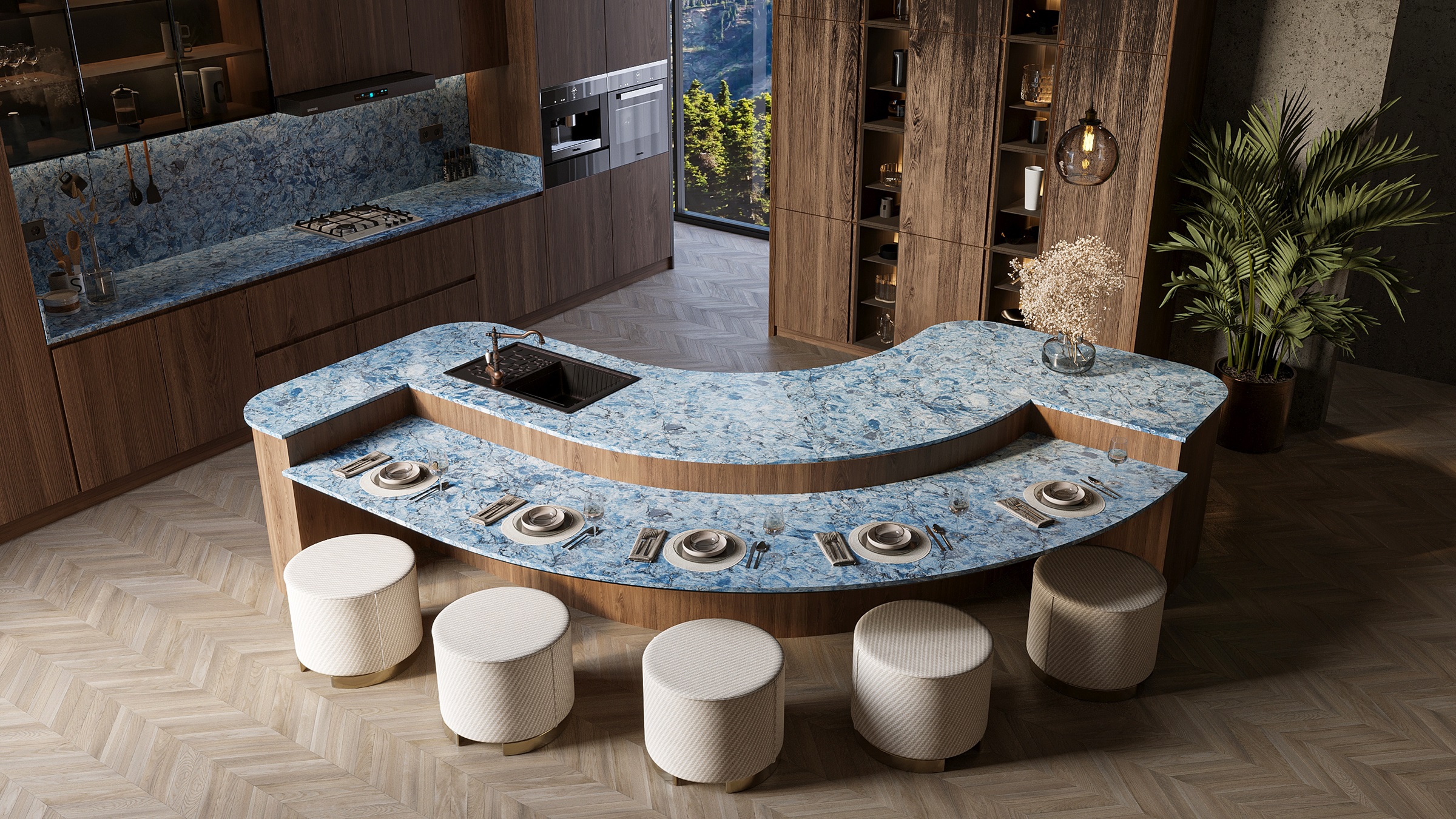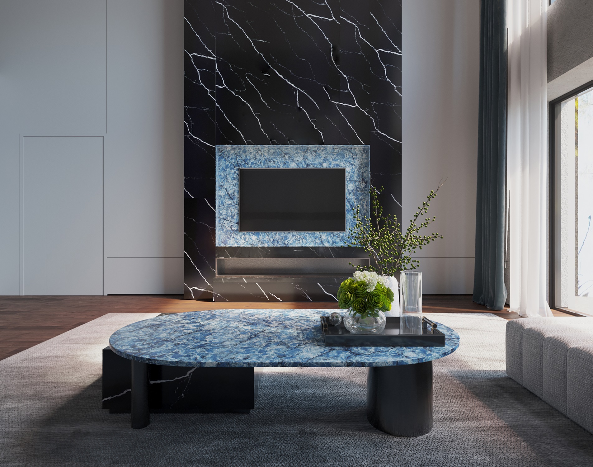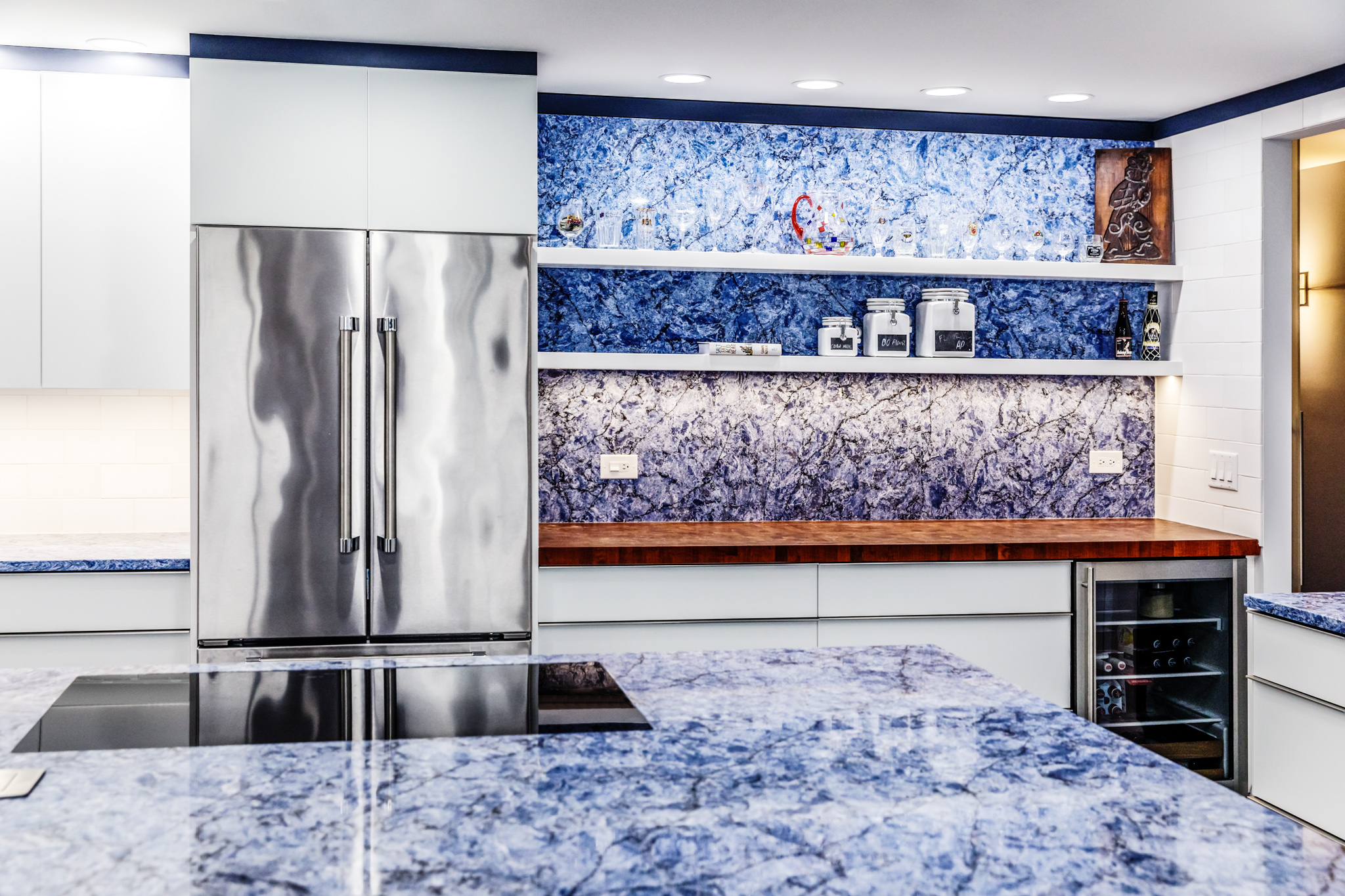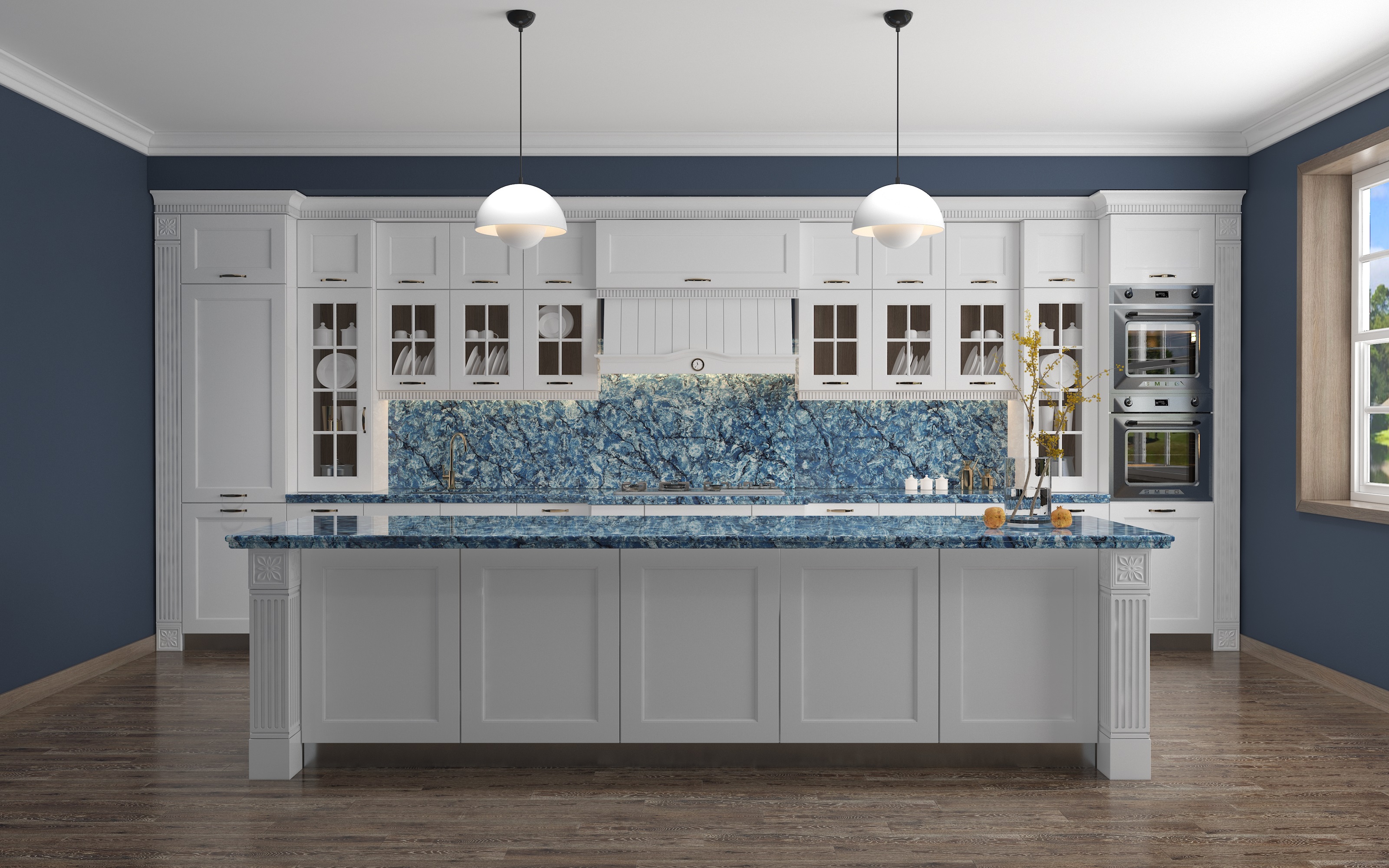 From Vicostone’s Thunder Series, Thunder Blue dark veins pop on an ocean-blue granite-look background.