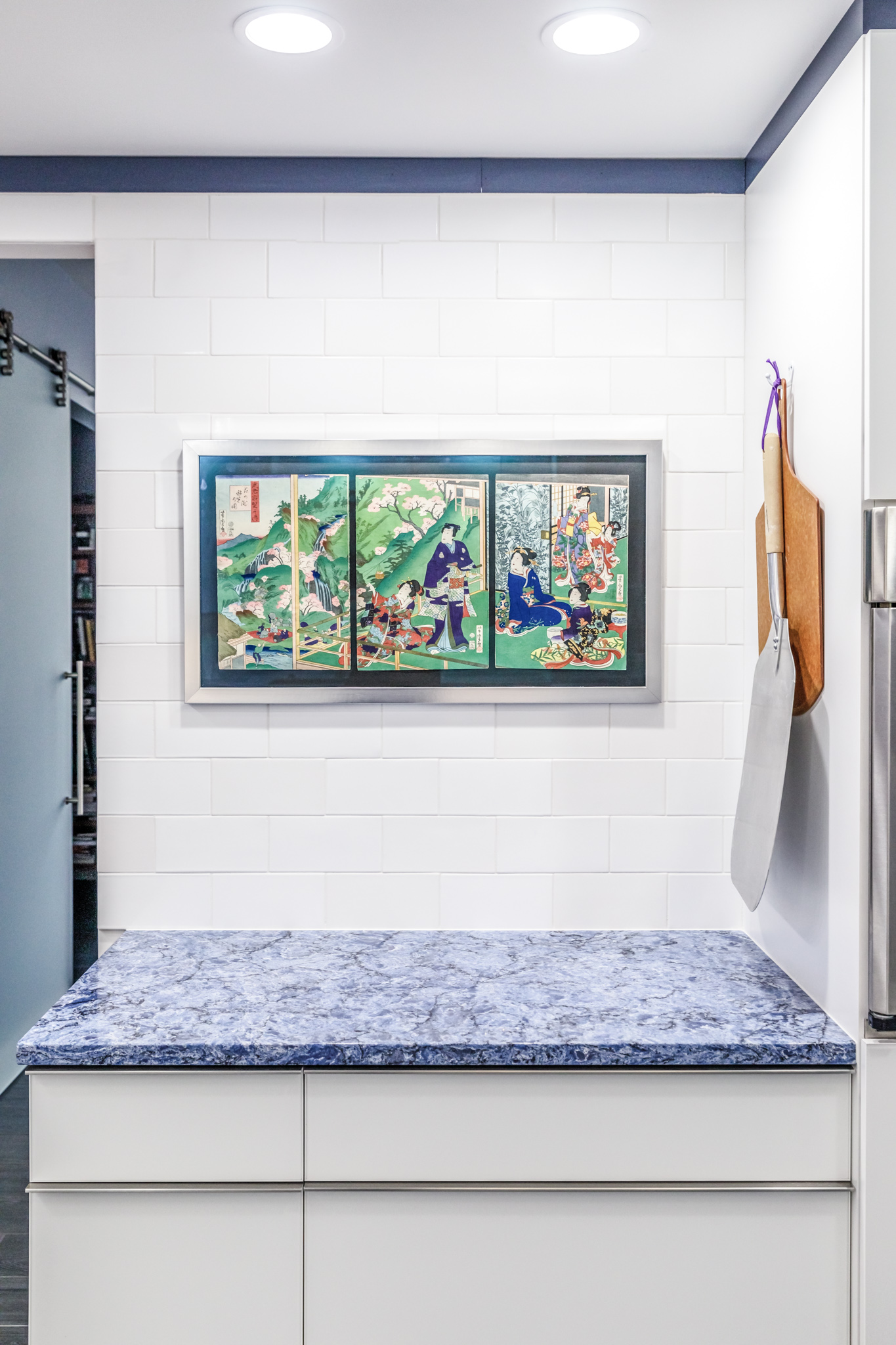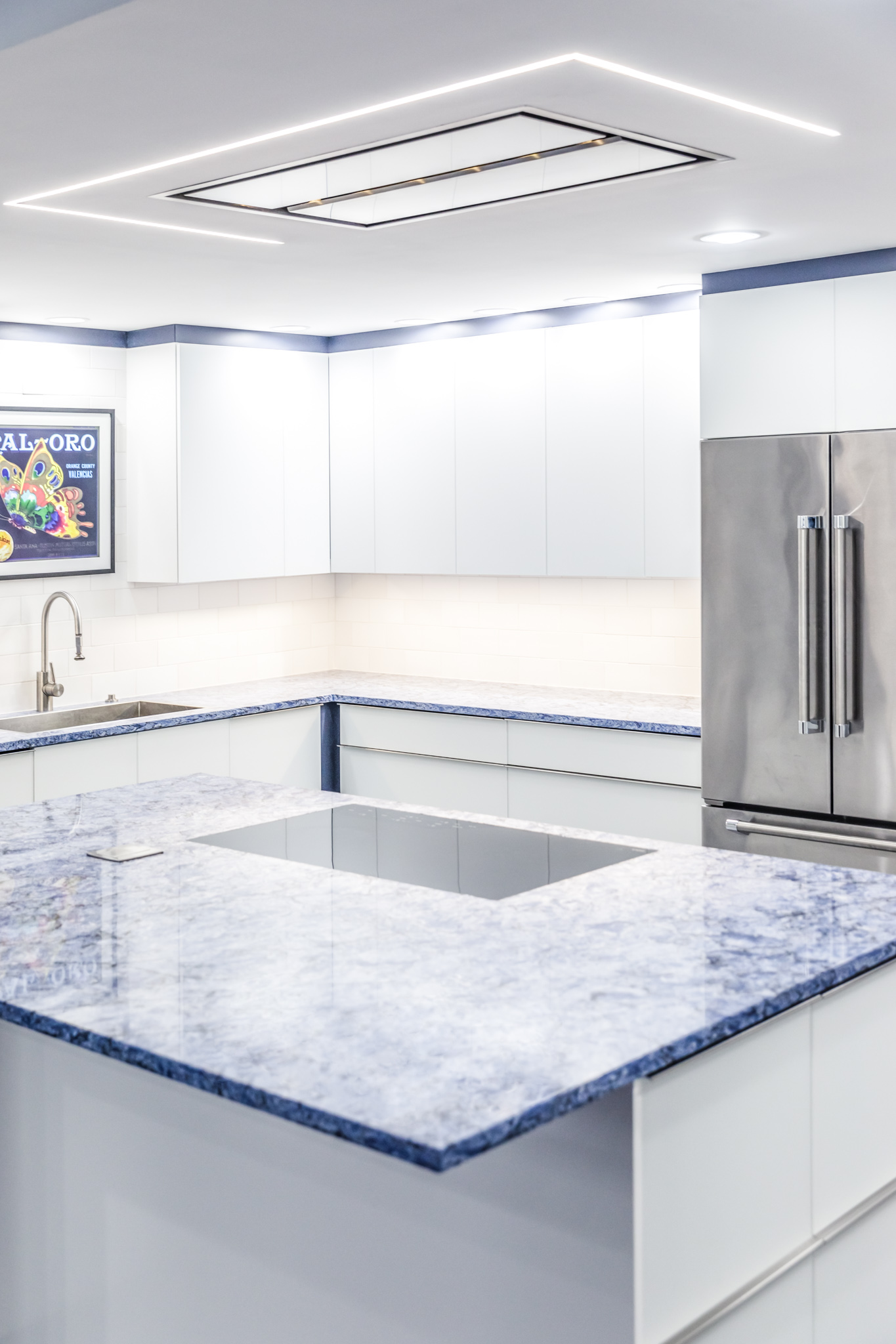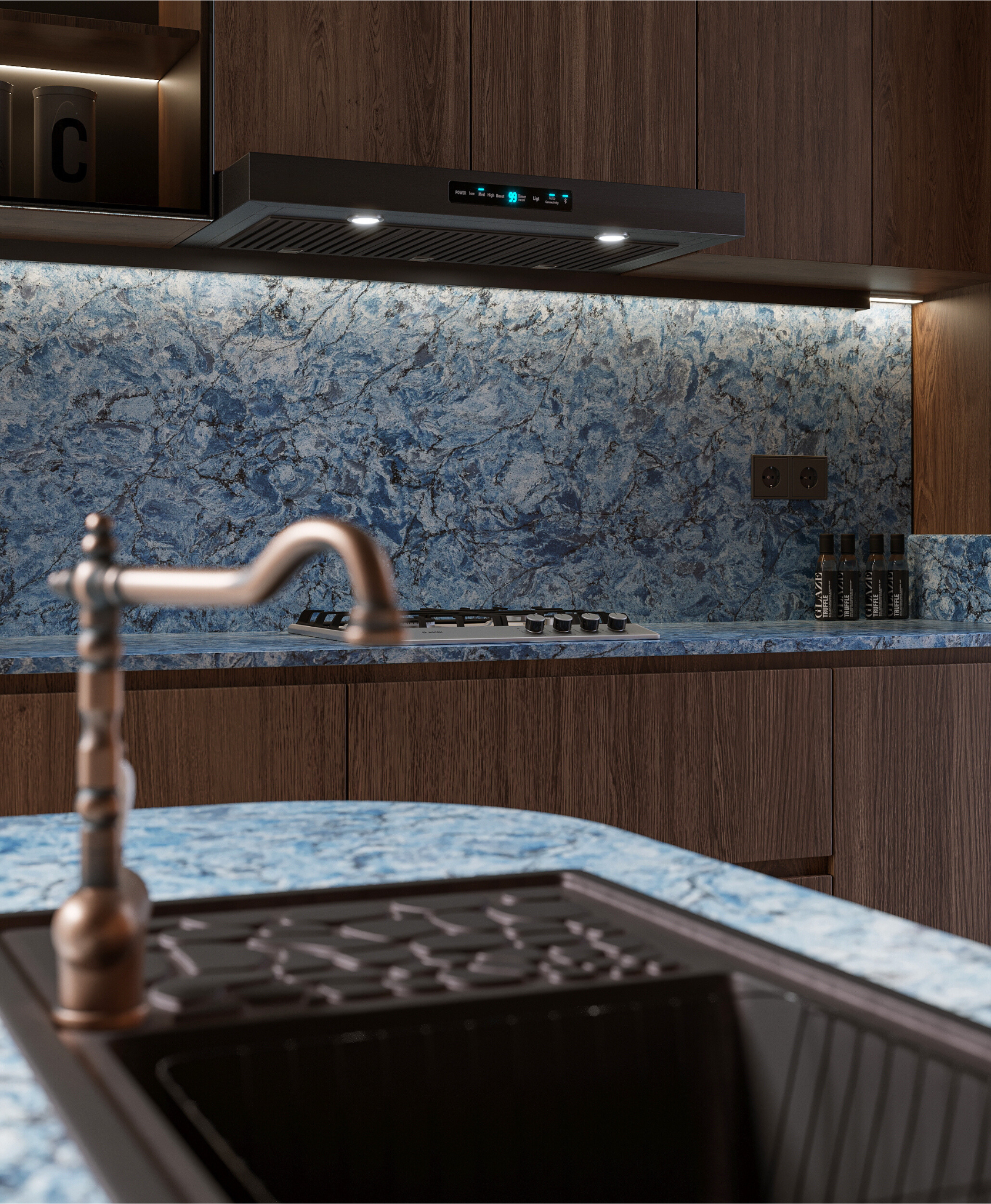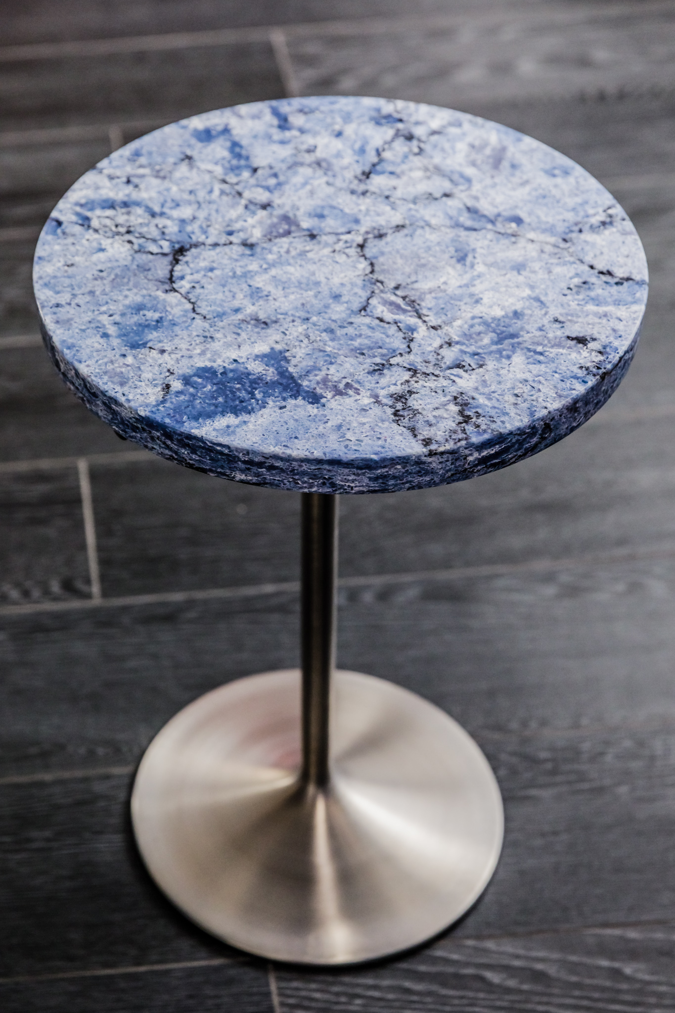 From Vicostone’s Thunder Series, Thunder Blue dark veins pop on an ocean-blue granite-look background.