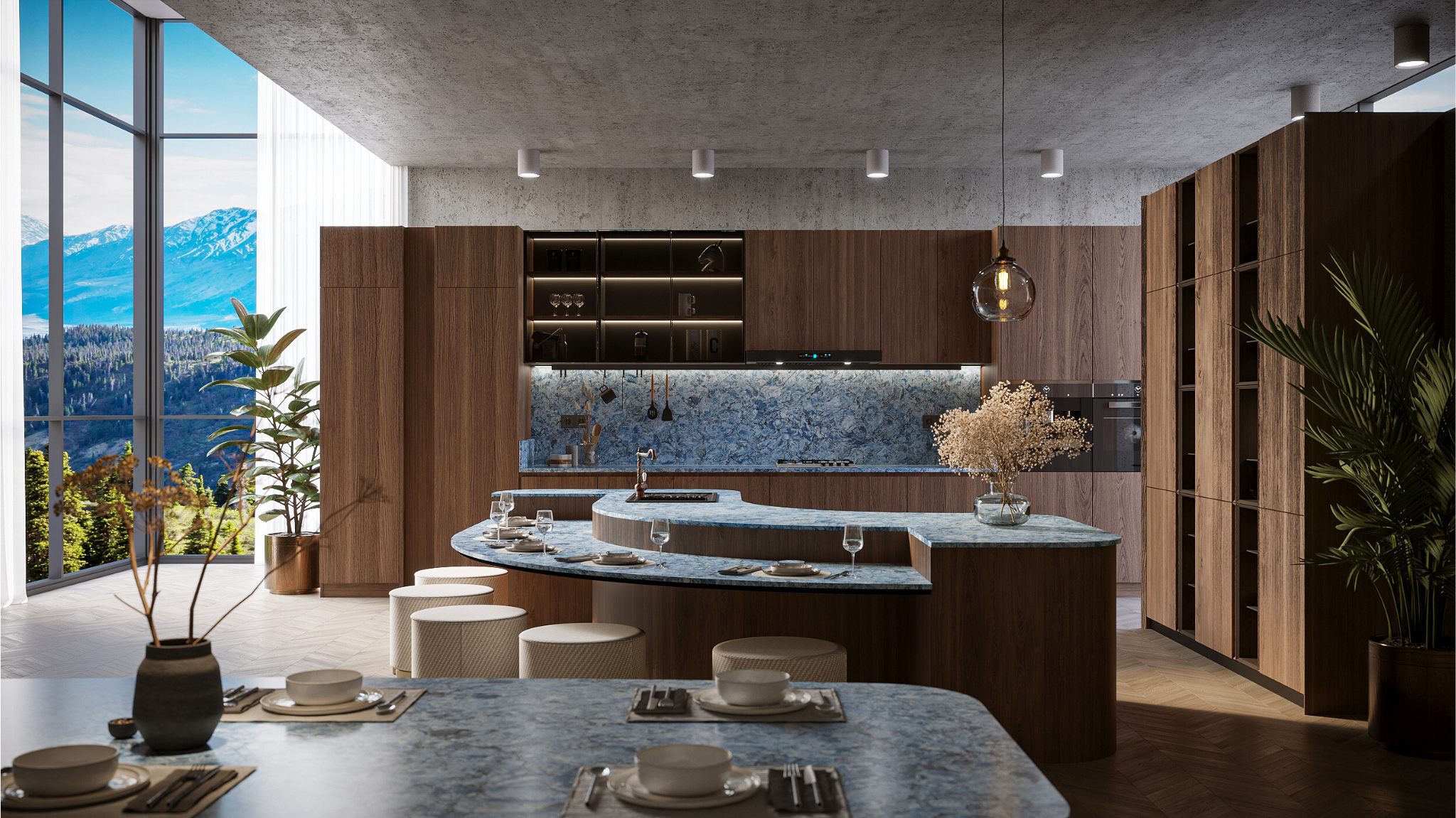 Inspired by the vast horizons and sweeping views of high-altitude adventures, this surface captures a sense of limitless freedom and grandeur. Featuring iridescent clouds, it showcases a spectrum of colors that create striking contrasts while highlighting the quartzite's layered depth.