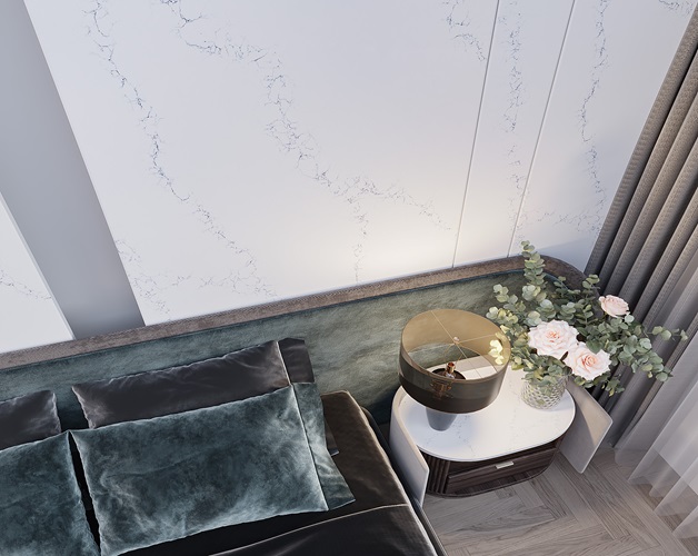 Vicostone Limnias features Japanese Blue Veins feathered across the pure white marble-like background. Limnias follows the wellness trend of incorporating natural hues in interior design that has been popular in recent years.