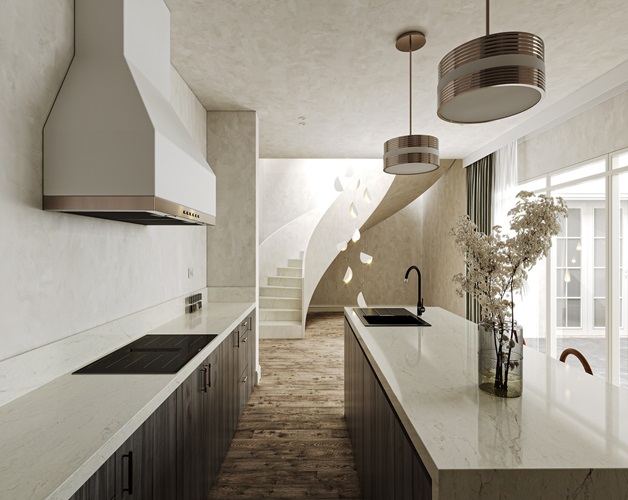 Lấy cảm hứng từ dòng nước mưa róc rách trên tán lá và chảy dọc theo thân cây cổ thụ xuống đất, VICOSTONE® Tyrol® BQ6705 tinh tế kết hợp nhiều lớp vân xám đậm, xám nhạt và nâu vàng, mang lại vẻ sống động và đầy chiều sâu cho mọi không gian.