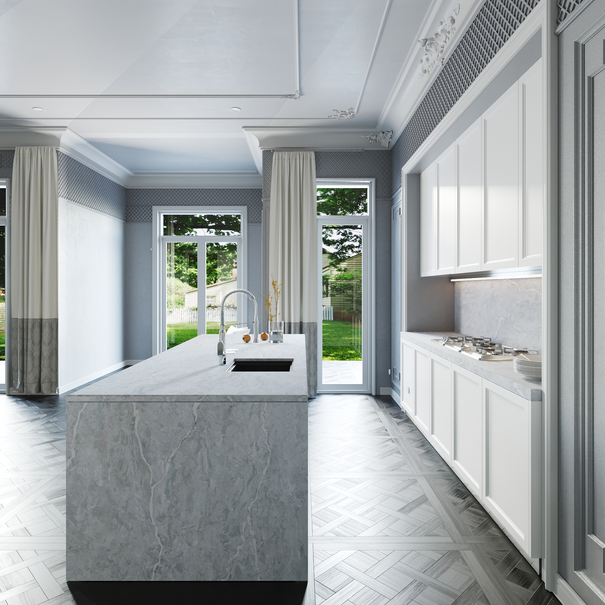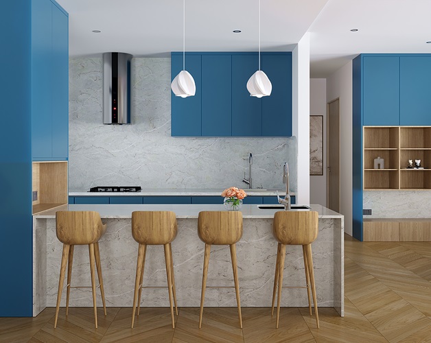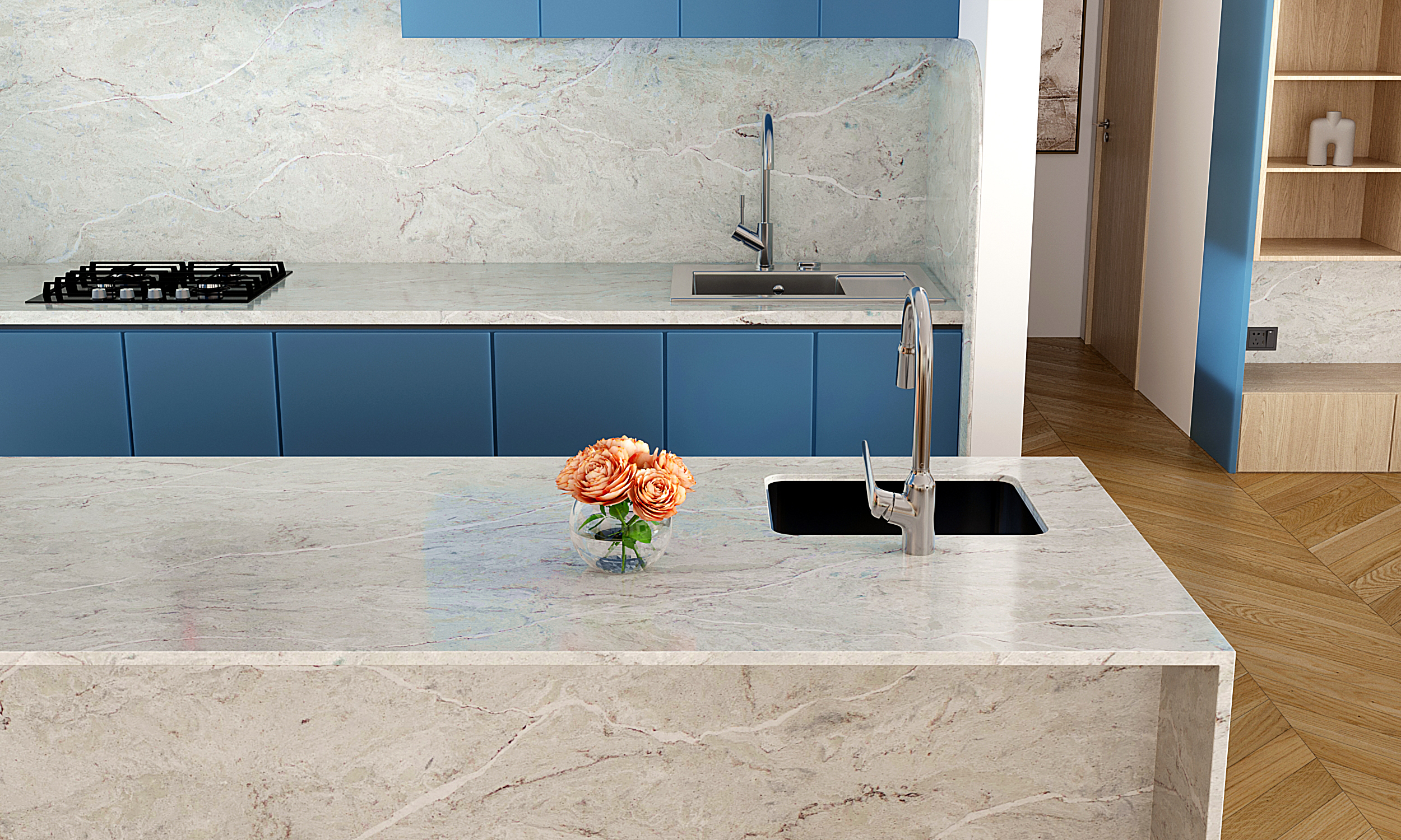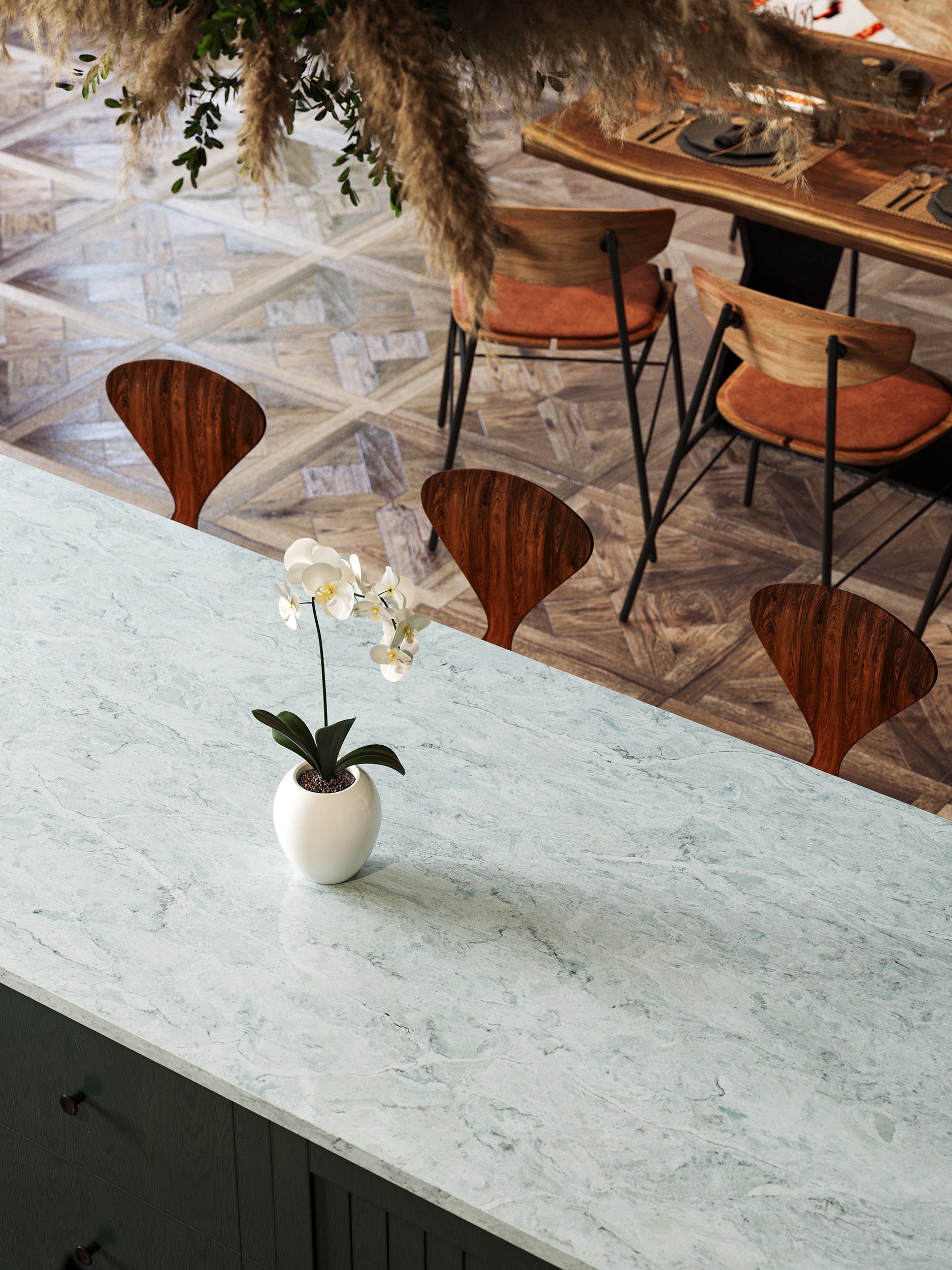 Những đường vân mảnh mai màu trắng trên nền đá hiệu ứng cẩm thạch điểm xuyết xanh nhạt độc đáo của VICOSTONE® Verdelia® BQ7704 gợi nhắc đến biển xanh như ngọc dịu mát, an lành trong ánh nắng lấp lánh buổi bình minh.