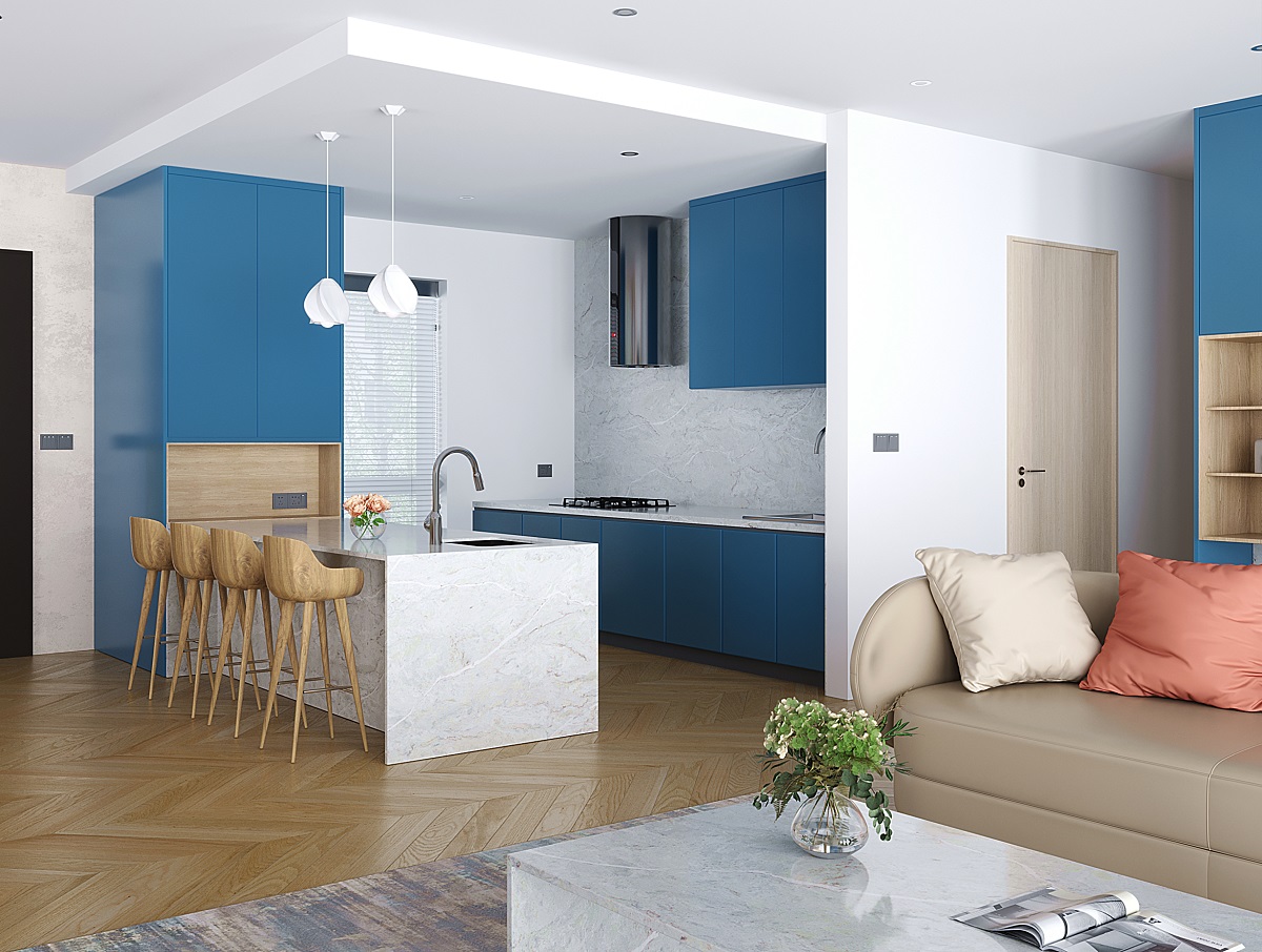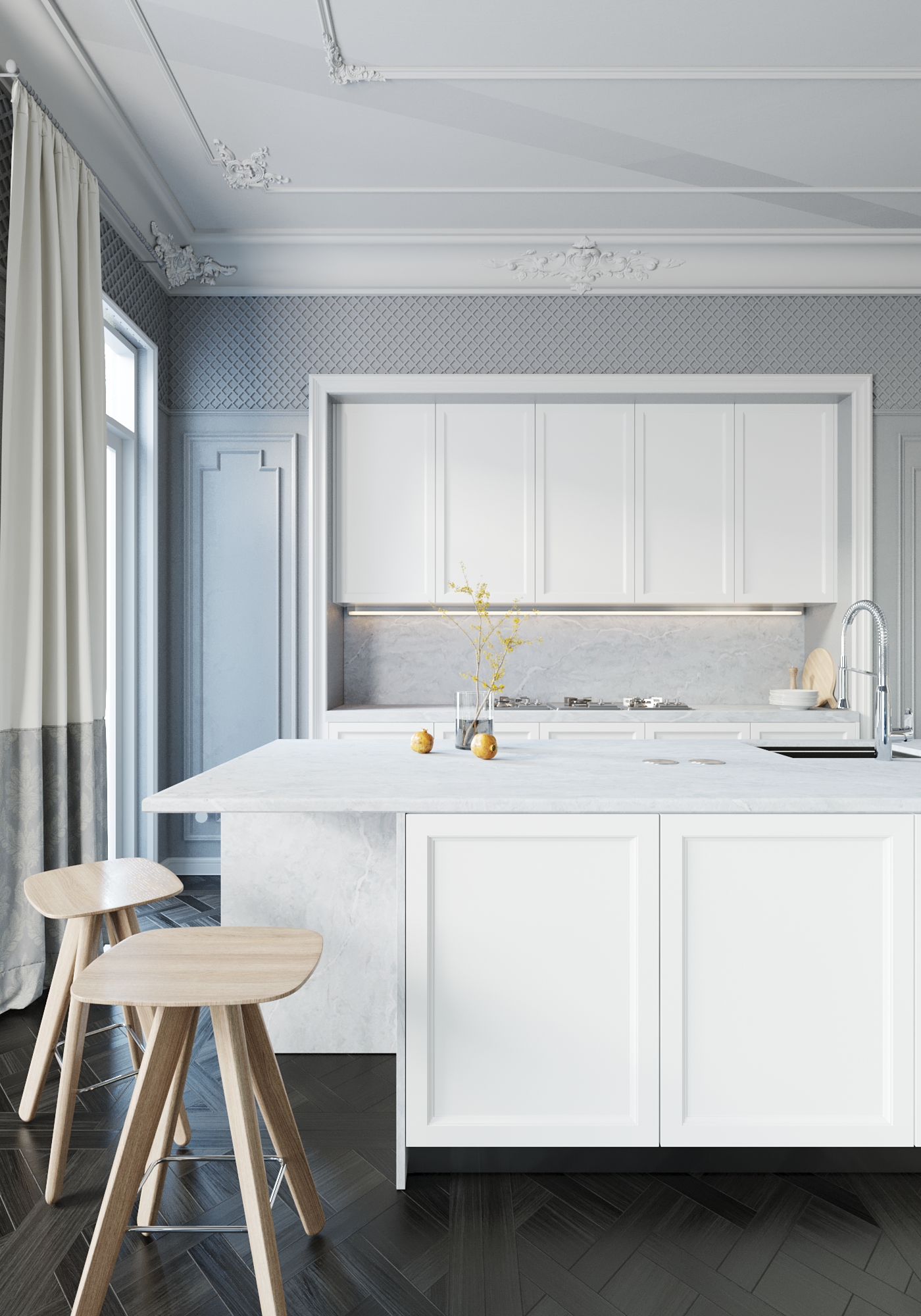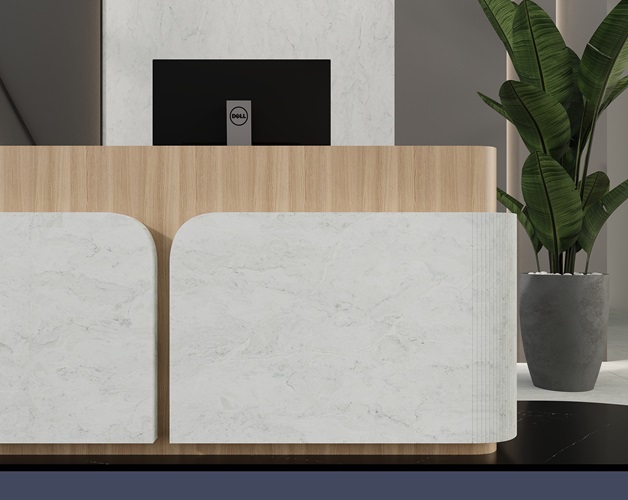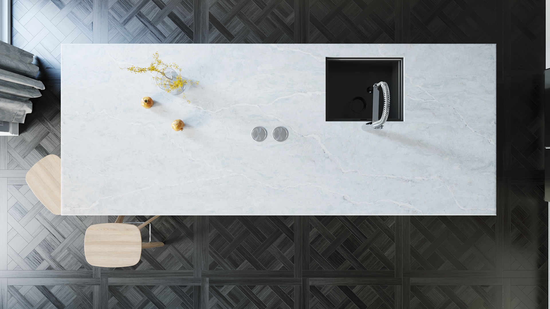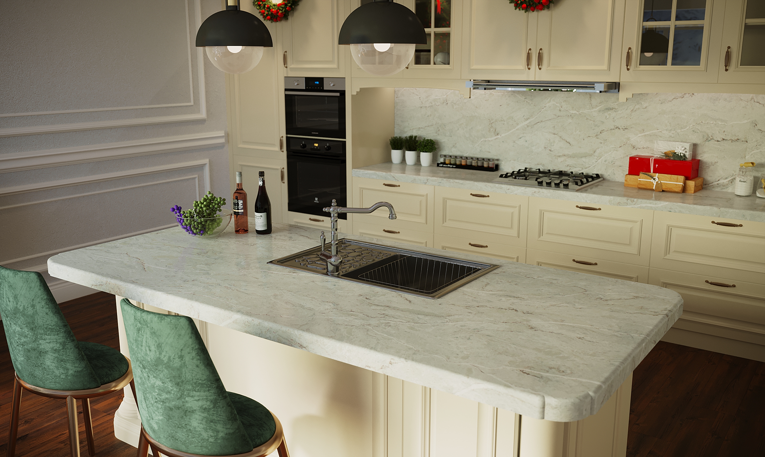 Những đường vân mảnh mai màu trắng trên nền đá hiệu ứng cẩm thạch điểm xuyết xanh nhạt độc đáo của VICOSTONE® Verdelia® BQ7704 gợi nhắc đến biển xanh như ngọc dịu mát, an lành trong ánh nắng lấp lánh buổi bình minh.