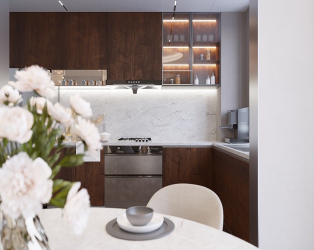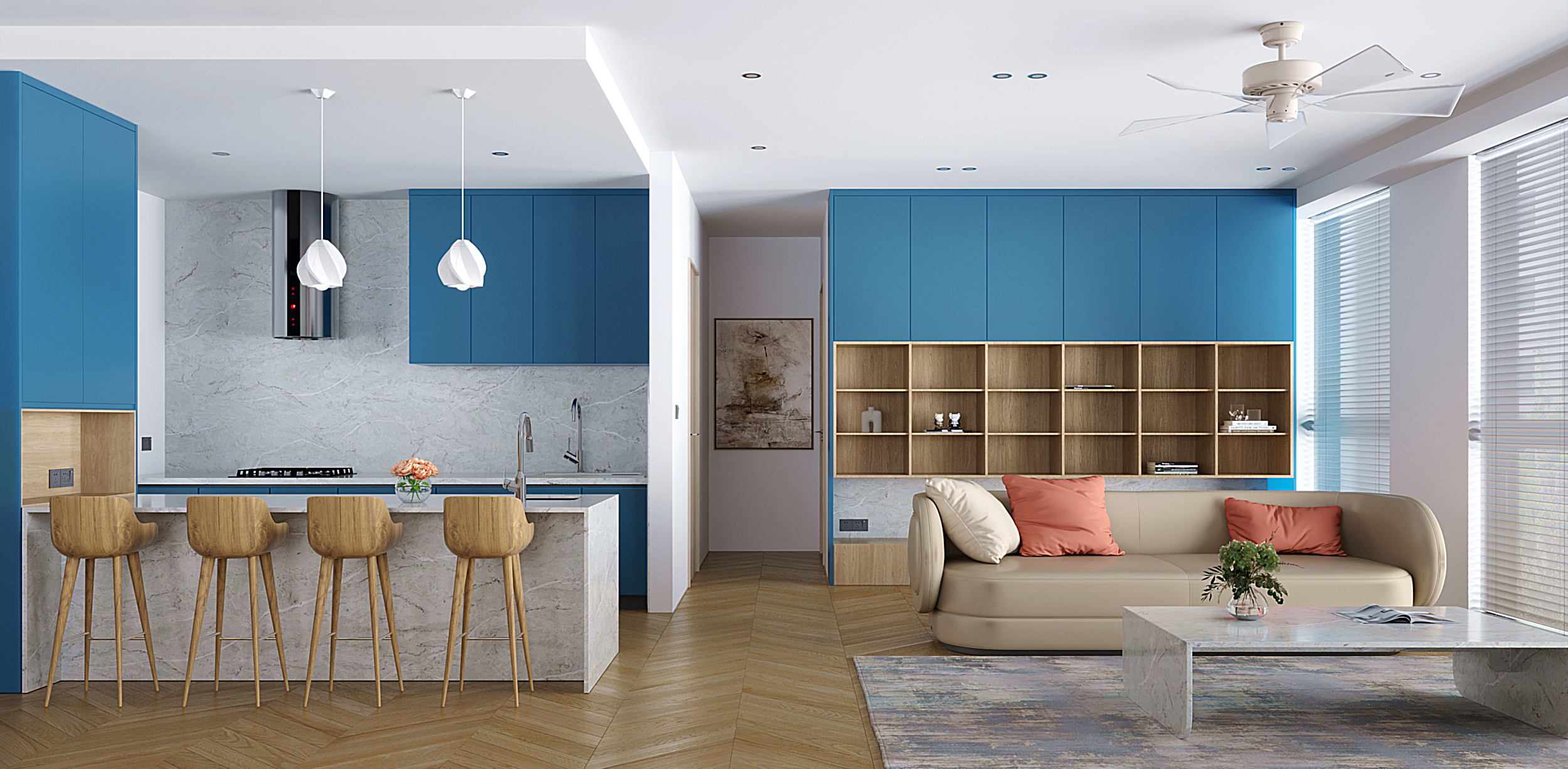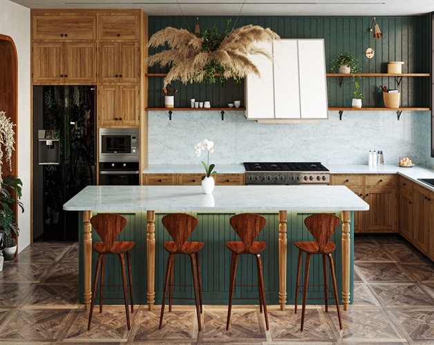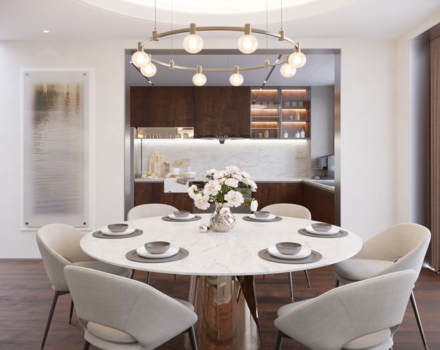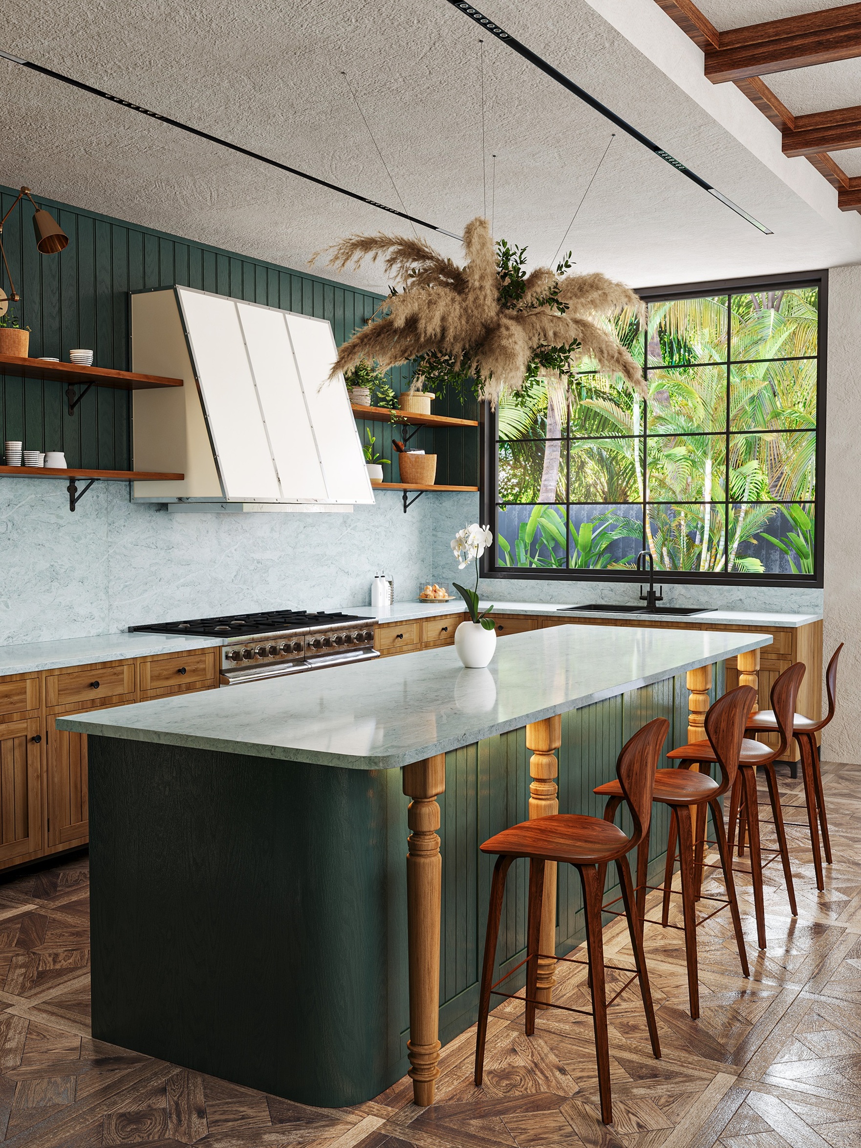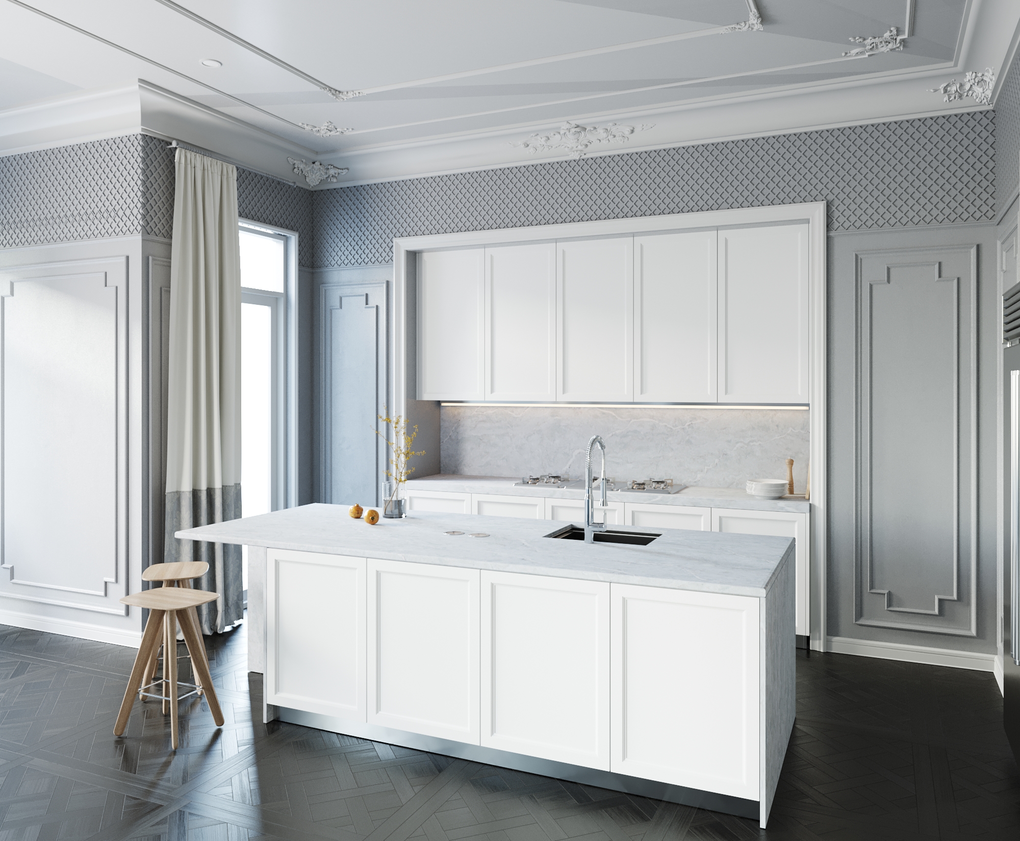 Những đường vân mảnh mai màu trắng trên nền đá hiệu ứng cẩm thạch điểm xuyết xanh nhạt độc đáo của VICOSTONE® Verdelia® BQ7704 gợi nhắc đến biển xanh như ngọc dịu mát, an lành trong ánh nắng lấp lánh buổi bình minh.