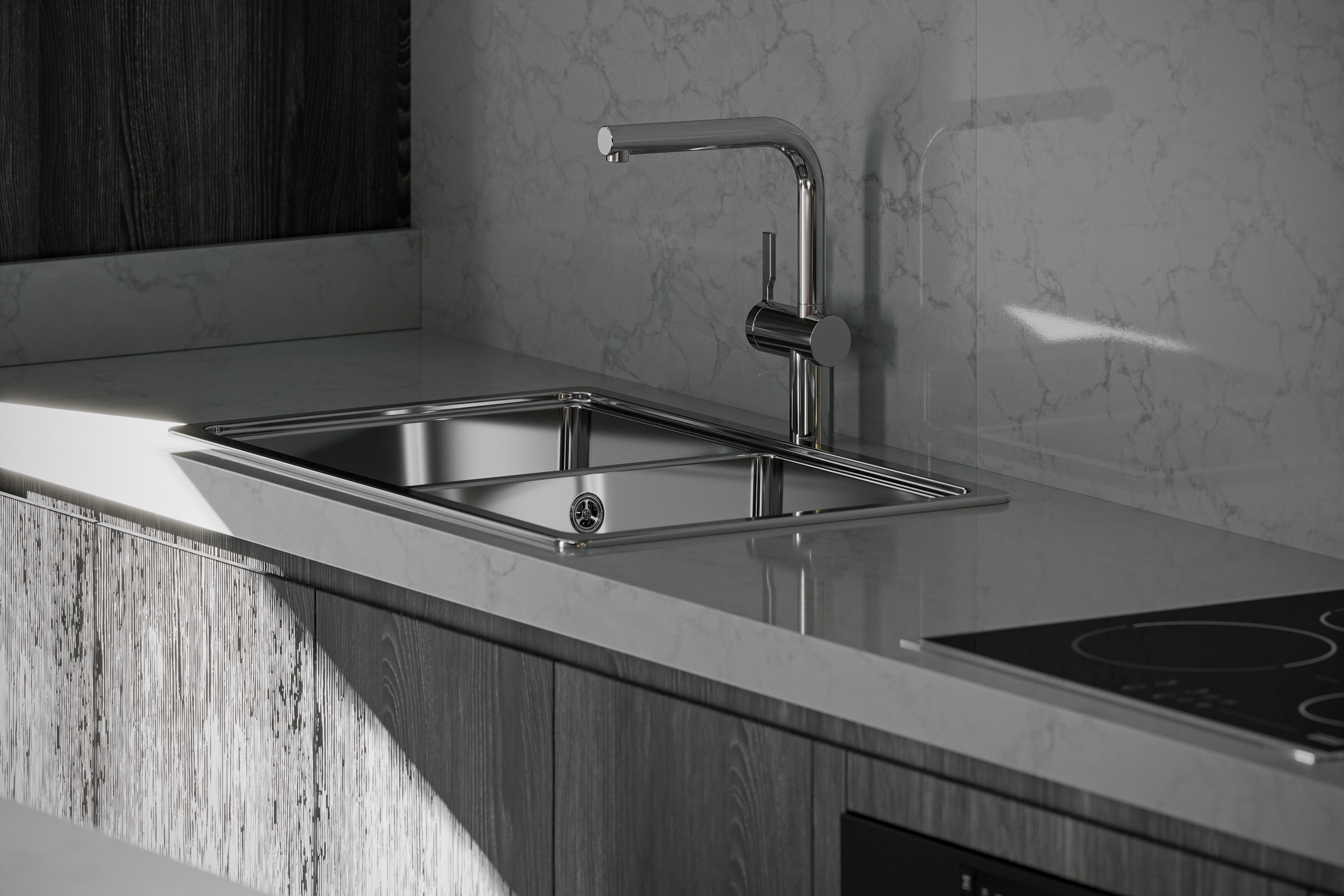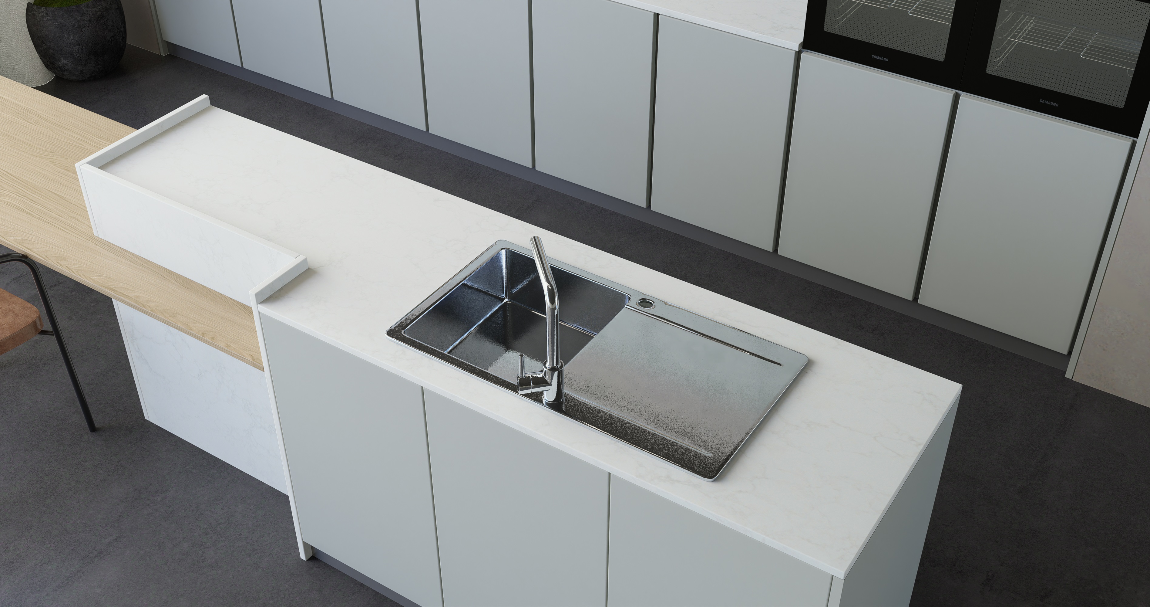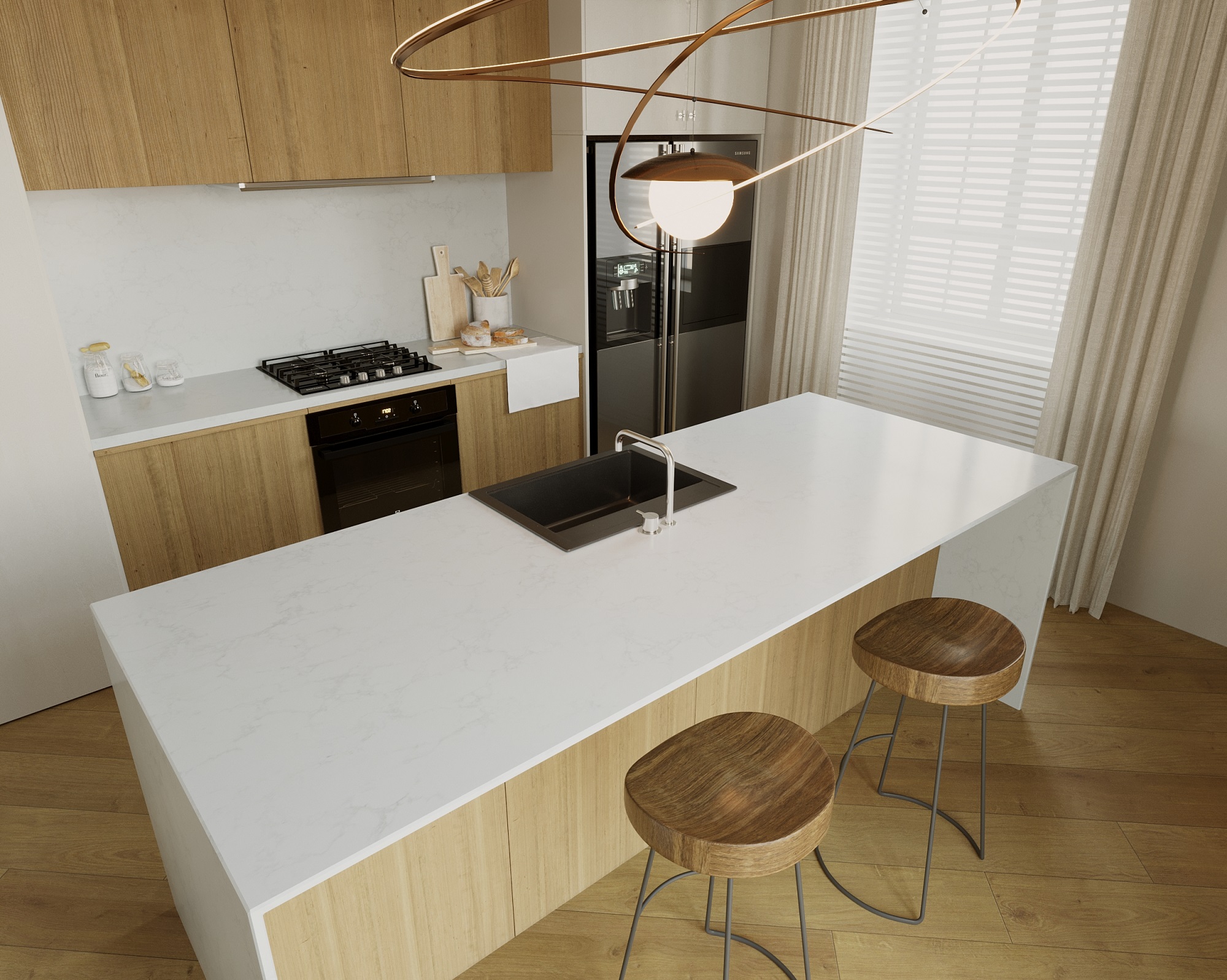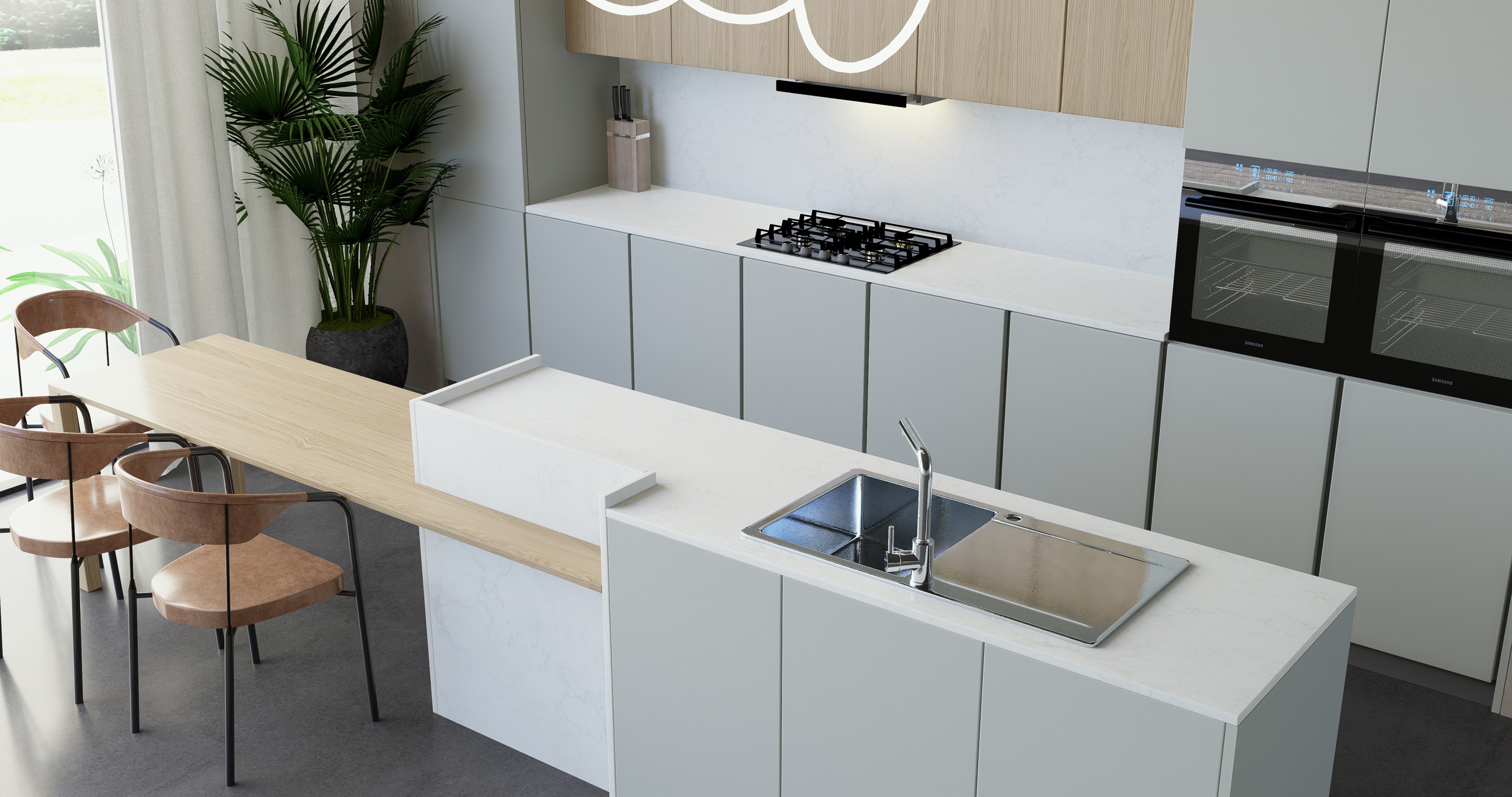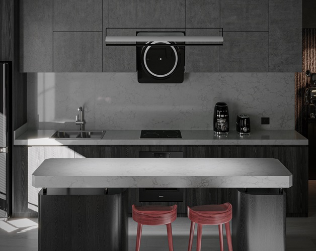 Vicostone Delta™ BQ8402 thể hiện sự chuyển động sống động giữa nhiều lớp vân lớp màu khác nhau trên bề mặt. Các lớp vân xám rối đậm nhạt như màn sương mù đan xen trên nền đá tựa cẩm thạch trắng lấy cảm hứng từ đá tự nhiên Arabescato, tái hiện khung cảnh tuyệt đẹp của những đám mây bụi vũ trụ.