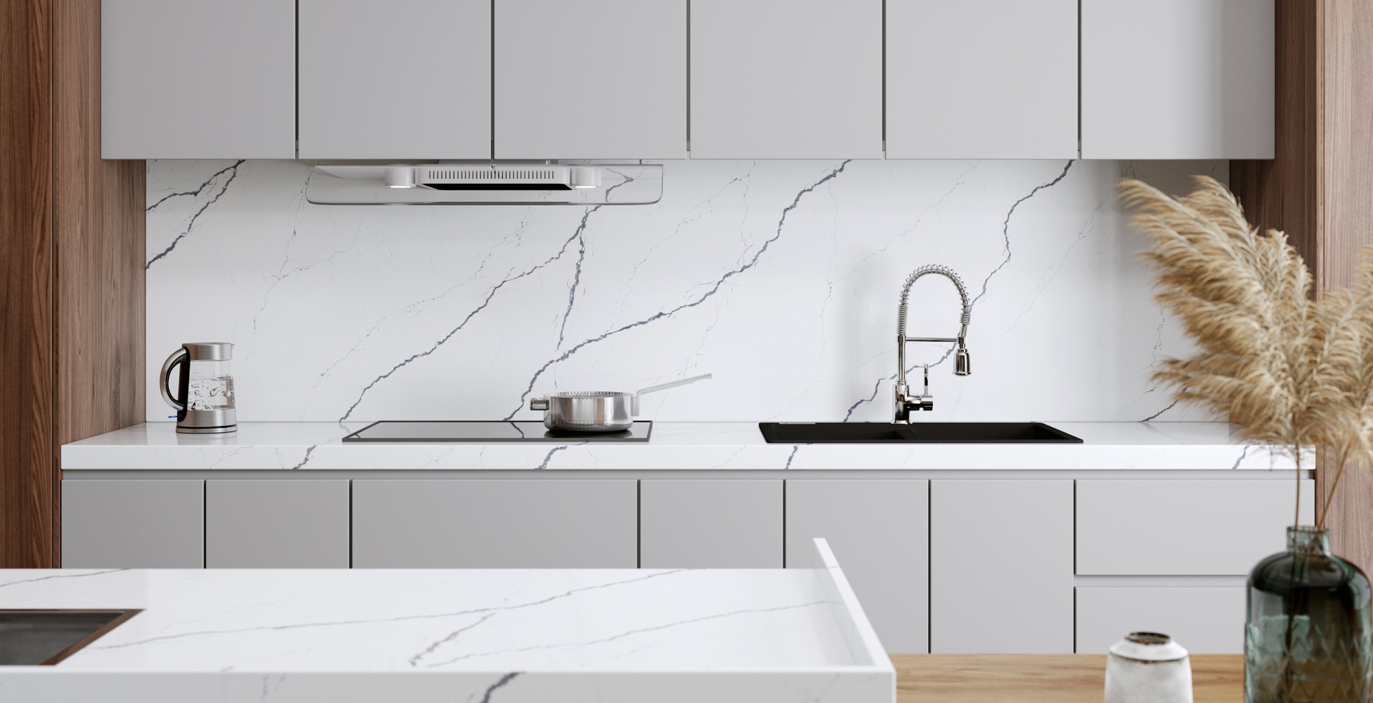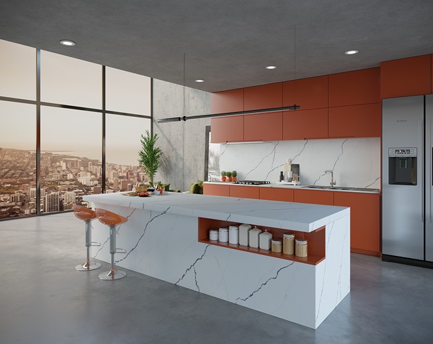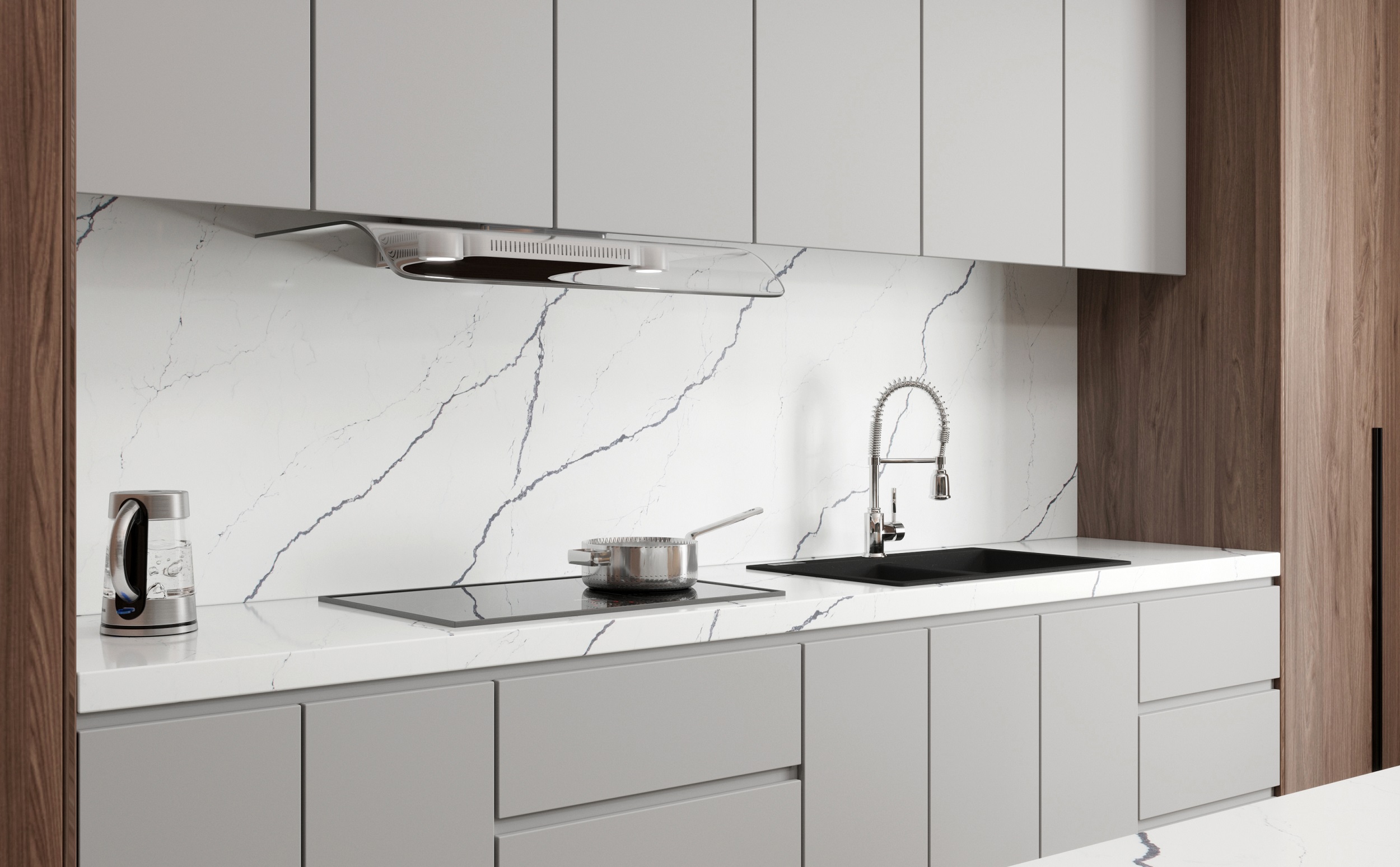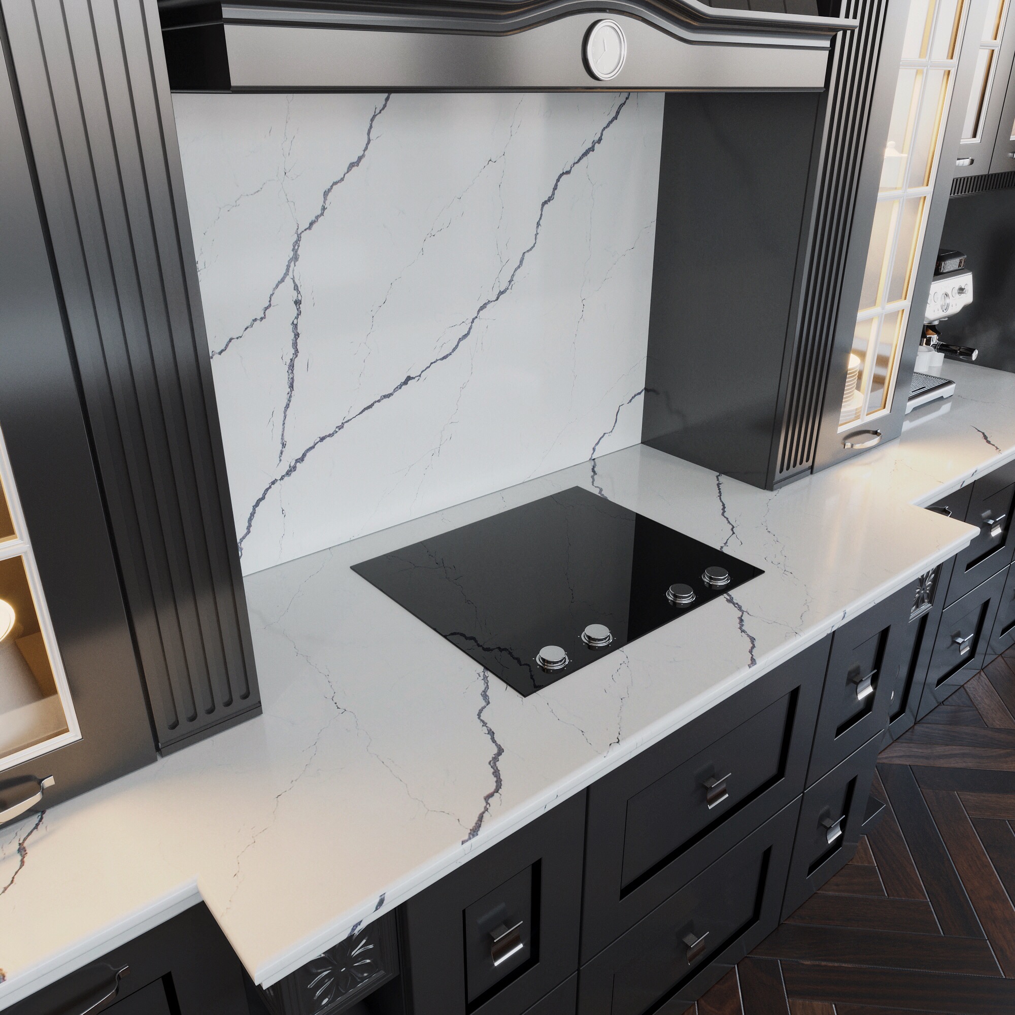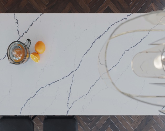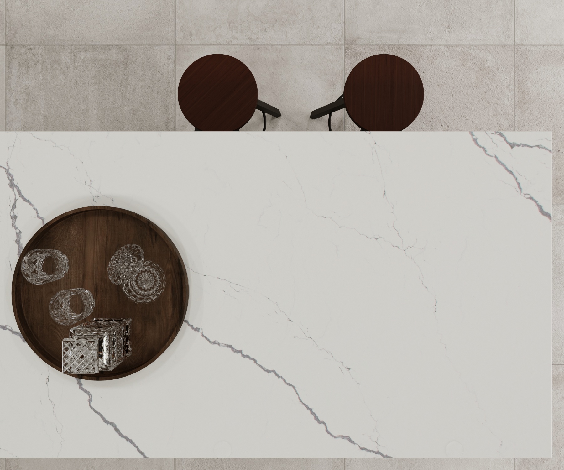 Sản phẩm đá Vicostone Greylac nổi bật với những đường vân rạn, như những tia sét đánh mạnh mẽ trải dài toàn tấm. Các đường vân xám đậm màu càng trở nên nổi bật hơn trên bề mặt mô phỏng hiệu ứng cẩm thạch trắng sáng.