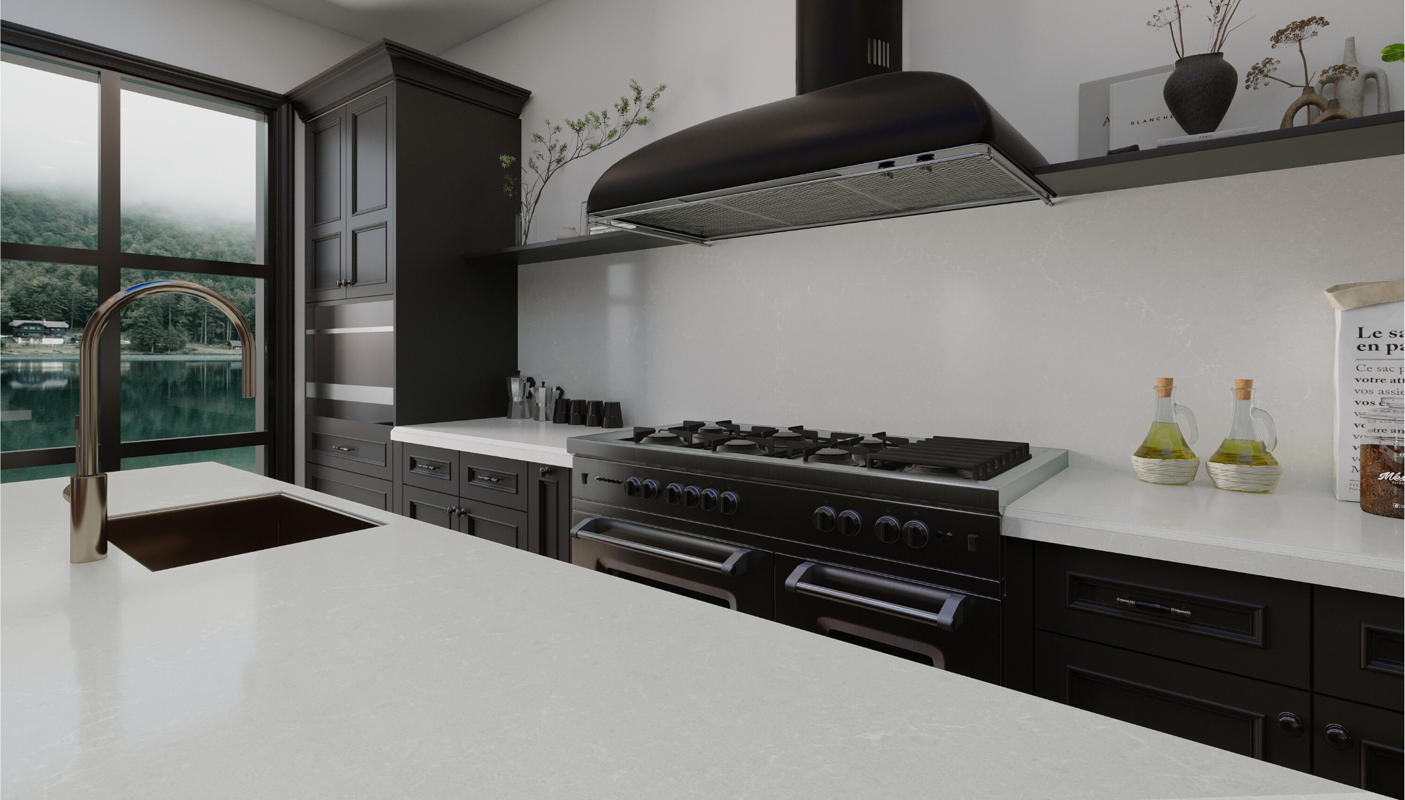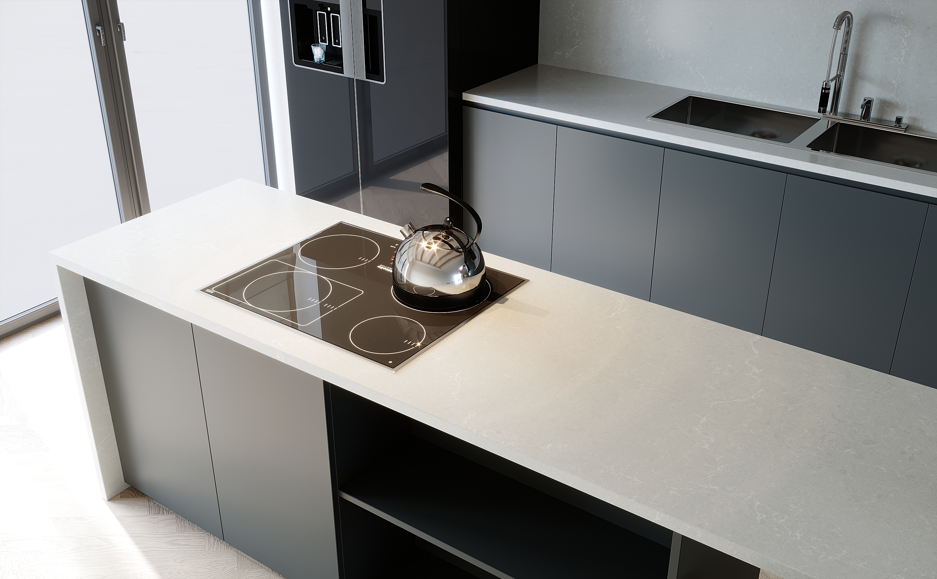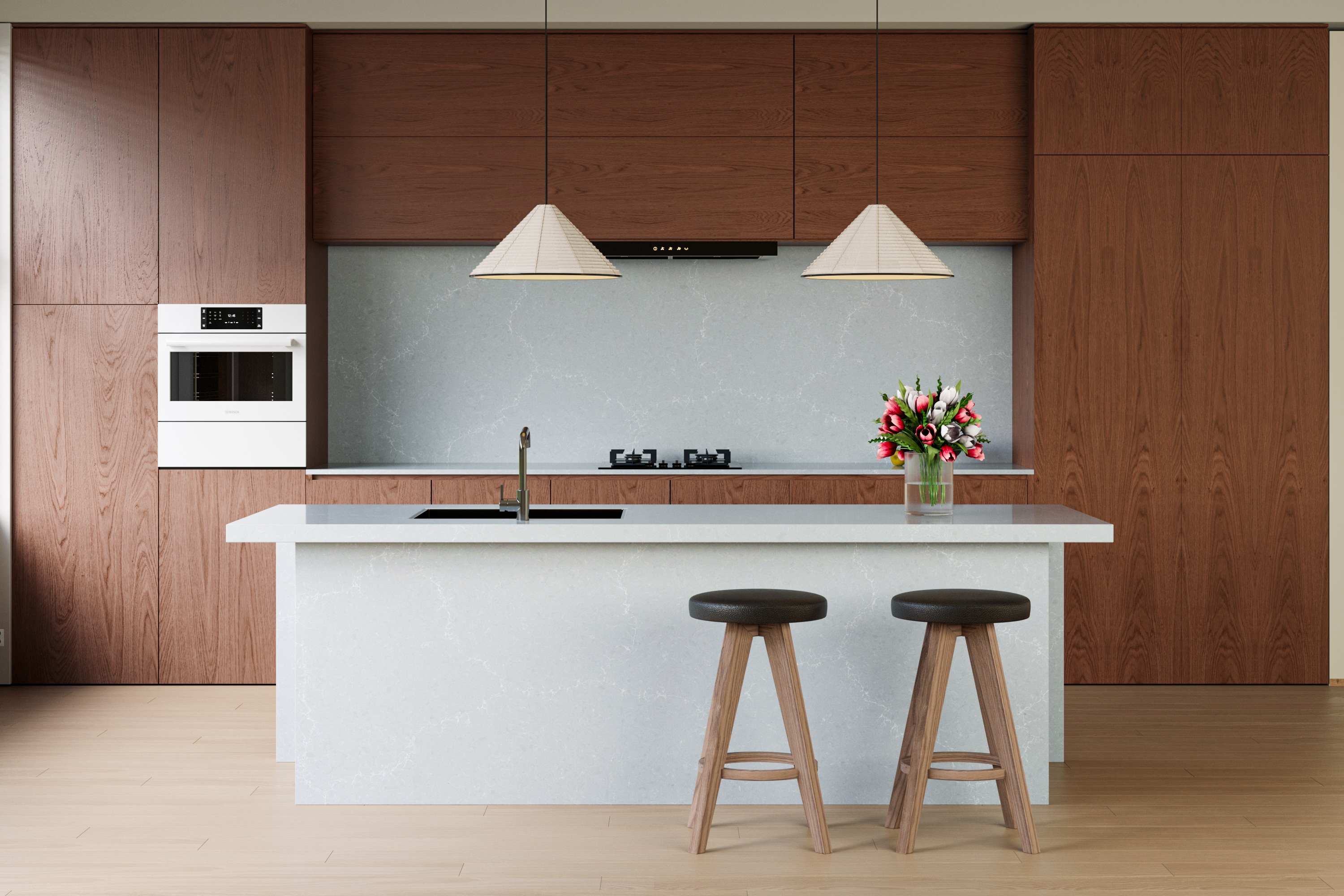 VICOSTONE Misterio Avo đan xen những lớp vân màu trắng trải rộng trên nền đá tựa cẩm thạch Avorio tinh tế, mô phỏng vẻ đẹp độc đáo bề mặt các hành tinh.